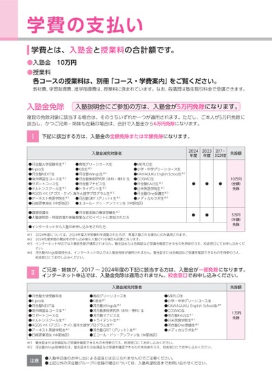 学費の支払い学費とは、入塾金と授業料の合計額です。●入塾金10万円●授業料各コースの授業料は、別冊「コース・学費案内」をご覧ください。教材費、学習指導費、進学指導費は、授業料に含まれています。なお、各講習は塾生割引料金で受講できます。入塾金免除入塾説明会にご参加の方は、入塾金が5万円免除になります。複数の免除対象に該当する場合は、そのうちいずれか一つが適用されます。ただし、ご本人が5万円免除に該当し、かつご兄弟・姉妹も在籍の場合は、合計で入塾金から6万円免除になります。Ⅰ下記に該当する方は、入塾金の全額免除または半額免除になります。入塾金減免対象者2024年度2023年度2017〜2022年度免除額●河合塾大学受験科生※1●K-pro生●河合塾NEXT生●海外帰国生コース生※3●サポートコース生●ドルトンスクール生※3●AGOS×K(アゴス・ケイ)海外大進学プログラム生※3●アーネスト英語学院生※3●日能研東海生(中部地区)●高校グリーンコース生●K会生※3●河合塾Wins生※4●河合塾美術研究所(本科・専科)生●河合塾マナビス生●トライデント生※3●河合塾GRIT(グリット)生※3●エコール・ドゥ・アンファン生(中部地区)●MEPLO生●小学・中学グリーンコース生●KAWAIJUKUEnlishSchool生※3●COSMO生●河合塾KALS生※3●日米英語学院生※3●河合塾One受講生※3●メディカルラボ生※3●●●10万円(全額)免除●講習受講生●入塾説明会・特設会場や体験授業などのイベントに参加された方●河合塾実施の模試受験生※2●インターネットから入塾のお申し込みをされた方●●5万円(半額)免除※12024年度については、2024年度大学受験科を退塾された方が、再度入塾される場合にのみ適用されます。※22024年度実施の模試をお申し込み後に入塾される場合も対象となります。※3インターネット申込では入塾金免除が適用されません。塾生証または会員証など受講を確認できるものを持参のうえ、校舎窓口にてお申し込みくだ※4河合塾Wins高等部生は、インターネット申込では入塾金免除が適用されません。塾生証または会員証など受講を確認できるものを持参のうえ、さい。校舎窓口にてお申し込みください。Ⅱご兄弟・姉妹が、2017〜2024年度の下記に該当する方は、入塾金が一部免除になります。インターネット申込では、入塾金免除は適用されません。校舎窓口でお申し込みください。入塾金減免対象者●河合塾大学受験科生●K-pro生●河合塾NEXT生●海外帰国生コース生※1●サポートコース生●ドルトンスクール生※1●AGOS×K(アゴス・ケイ)海外大進学プログラム生※1●アーネスト英語学院生※1●日能研東海生(中部地区)●高校グリーンコース生●K会生※1●河合塾Wins生※2●河合塾美術研究所(本科・専科)生●河合塾マナビス生●トライデント生※1●河合塾GRIT(グリット)生※1●エコール・ドゥ・アンファン生(中部地区)●MEPLO生●小学・中学グリーンコース生●KAWAIJUKUEnlishSchool生※1●COSMO生●河合塾KALS生※1●日米英語学院生※1●河合塾One受講生※1●メディカルラボ生※1免除額1万円免除※1塾生証または会員証など受講を確認できるものを持参のうえ、校舎窓口にてお申し込みください。※2河合塾Wins高等部生は、塾生証または会員証など受講を確認できるものを持参のうえ、校舎窓口にてお申し込みください。注意●入塾申込後のお申し出による返金には応じられませんのでご注意ください。●上記以外の河合塾グループに在籍の場合については、入塾希望校舎までお問い合わせください。