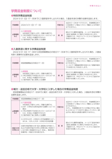 学費返金制度について●特別学費返金制度2024/3/31(日)17:00までに入塾辞退を申し出られた場合、入塾金を含む学費の全額を返金します。手続期限2024/3/31(日)17:00手続方法左記の①〜③をすべてそろえて、手続期限日までに校舎窓口へご提出ください(電話による手続きはできません)。学費の支払い必要書類など①入塾辞退届※校舎窓口で配付します。印鑑が必要です。②「申込手続完了のお知らせ」のメールのコピーまたは、お支払いを確認できるもの③入塾手続完了後に受領した全書類返金提出された書類を確認後、メールで「返金手続き(返金口座登録)のご案内」をお知らせします。ご確認のうえ、「申込マイページ」からご返金のお手続きをお願いいたします。●入塾辞退に関する学費返金制度2024/3/31(日)17:00から初回授業開始日の前日17:00までに入塾辞退を申し出られた場合、入塾金を除く授業料の全額を返金します。手続期限初回授業開始日の前日17:00手続方法左記の①〜③をすべてそろえて、手続期限日までに校舎窓口へご提出ください(電話による手続きはできません)。メールにて「退塾届受理のお知らせ」「退塾手続完了のお知らせ」をお送りします。必要書類など①退塾届※校舎窓口で配付します。印鑑が必要です。②「申込手続完了のお知らせ」のメールのコピーまたは、お支払いを確認できるもの③入塾手続完了後に受領した全書類返金提出された書類を確認後、メールで「返金手続き(返金口座登録)のご案内」をお知らせします。ご確認のうえ、「申込マイページ」からご返金のお手続きをお願いいたします。●補欠・追加合格で大学・大学校に入学した場合の学費返金制度初回授業開始日の前日17:00までに補欠・追加合格で大学・大学校に入学した場合、入塾金を含む学費の全額を返金します。手続期限初回授業開始日の前日17:00①入塾辞退届※校舎窓口で配付します。印鑑が必要です。②大学・大学校の合格を証明する書類(コピーの提出)必要書類など③「申込手続完了のお知らせ」のメールのコピーまたは、お支払いを確認できるもの④入塾手続完了後に受領した全書類手続方法左記の①〜⑤をすべてそろえて、手続期限日までに校舎窓口へご提出ください(電話による手続きはできません)。ただし、手続期限日までに⑤が提出できない場合は、4/30(火)17:00までに提出してください(提出がない場合は当制度は適用されません)。⑤入学する大学・大学校の入学手続書類のコピーまたは、入学した大学・大学校の在学証明書対象の大学・大学校とは文部科学省所管の大学・短大(通信制大学を除く)、および文部科学省が大学卒と同等の扱いを認めている大学校(防衛医科大など)を指し、専修学校・各種学校・外国の大学は除きます。返金提出された書類を確認後、メールで「返金手続き(返金口座登録)のご案内」をお知らせします。ご確認のうえ、「申込マイページ」からご返金のお手続きをお願いいたします。