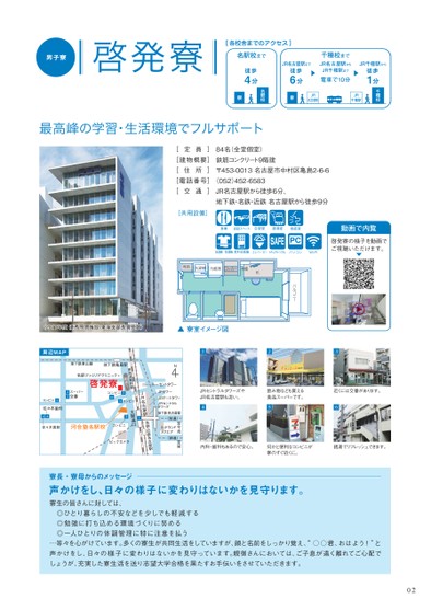 員定[][建物概要][][電話番号]][住所交通84名(全室個室)鉄筋コンクリート9階建〒453-0013名古屋市中村区亀島2-6-6(052)452-6583JR名古屋駅から徒歩6分、地下鉄・名鉄・近鉄名古屋駅から徒歩9分JR名古屋駅まで徒歩6分千種校までJR名古屋駅からJR千種駅まで電車で10分JR千種駅から徒歩1分千種校JR千種駅寮JR名古屋駅名駅校まで徒歩4分名駅校寮[各校舎までのアクセス]男子寮啓発寮最高峰の学習・生活環境でフルサポート[共用設備]食事談話スペース自習室湯沸室音読室洗濯機/乾燥機飲料自販機エレベーターセキュリティ・システムパソコンWi-Fi動画で内覧啓発寮の様子を動画でご視聴いただけます。バルコニー靴箱洗濯機冷蔵庫ロッカー本棚机02JRセントラルタワーズやJR名古屋駅も近い。飲み物なども買える食品スーパーです。近くには交番があります。4566552354451内科・歯科もあるので安心。何かと便利なコンビニが寮のすぐ近くに。銭湯でリフレッシュできます。寮長・寮母からのメッセージ声かけをし、日々の様子に変わりはないかを見守ります。寮生の皆さんに対しては、◎ひとり暮らしの不安などを少しでも軽減する◎勉強に打ち込める環境づくりに努める◎一人ひとりの体調管理に特に注意を払う…等々を心がけています。多くの寮生が共同生活をしていますが、顔と名前をしっかり覚え、○○君、おはよう!”と声かけをし、日々の様子に変わりはないかを見守っています。親御さんにおいては、ご子息が遠く離れてご心配でしょうが、充実した寮生活を送り志望大学合格を果たすお手伝いをさせていただきます。〈2017年度優秀照明施設東海支部長賞受賞〉▲寮室イメージ図周辺MAP123