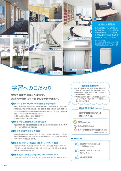 1個別指導コーナー2個別ブース型自習室41階スペース3音読室快適な学習環境安心して勉強していただくため、寮の自習室にパナソニック「空間除菌脱臭機ジアイーノ」※を設置!河合塾は集中できる快適な学習環境作りに力を注いでいます。※ジアイーノの効果プールやほ乳瓶の除菌にも使われる次亜塩素酸の効果で、机やドアノブなどに付着した菌やウイルスを99%以上抑制します。3ラーニング・コモンズ(談話スペース)4ウッドデッキ5ワイドサイズの机5冷暖房空調機&遮光カーテン学習へのこだわり学習を最優先に考えた環境で、志望大学合格に向け集中して学習できます。●講師によるオーダーメイド個別指導[申込制]1寮でも講師の指導を受けられる個別指導を実施。1科目につき、週1回90分間、年間25回。事前に申請された1~2科目(英語・数学・現代文・古文・物理・化学・生物を開設予定)の個別指導を行います。テキストの予習・復習や模試の復習など、ニーズにあわせた学習を行えます。※講師1人に対して生徒2~3人の個別指導です。※メディカルラボ生は申し込みできません。●集中できる寮生専用自習室を完備2勉強に集中できる自習室を完備。他の寮生たちから刺激を受けて、高いモチベーションを保つことができます。●学習を最優先に考えた環境!3友達と教え合いながら勉強できる「ラーニング・コモンズ(談話スペース)」や、英語の発音練習ができる「音読室」、情報収集用のパソコン、学習サポート利用のためのWi-Fi環境などを完備。●静粛性、明かり、色調まで随所に「学び」へ配慮41階共用中央部には、吹き抜けのあるウッドデッキを配置。食堂にもフローリングの掘りごたつ席を設けるなどリラックス・リフレッシュできるスペースを確保。寮全体で学習効果を高めます。●機能的かつ集中力が高まるプライベートルーム5ワイドサイズの机(デスクライト付)、遮光カーテンなどをそろえ集中力をアップ。03個別指導受講生の声●授業で理解しきれなかった問題を質問したり、細かいところまで質問したりできて良かったです。●自分の状況を把握してくれて、それにあわせた助言や指導をしてくれました。●英作文を添削してもらい、再度書き直しといったことができ、具体的にどのように改善すれば良いかがわかりました。(複数回答)寮生に聞きました寮の学習環境について良いところは?123自室(46.3%)専用自習室(38.8%)赤本・参考書などの学習図書(31.3%)「塾生寮アンケートより」寮生の声自習をするのに適した生活環境でした。寮内に自習室があるのはありがたい。過去問が豊富!!