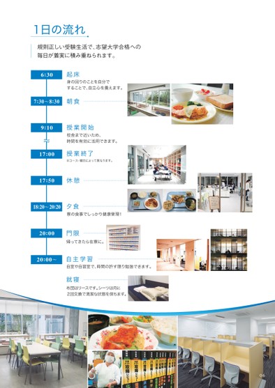 1日の流れ規則正しい受験生活で、志望大学合格への毎日が着実に積み重ねられます。6:30起床身の回りのことを自分ですることで、自立心を養えます。7:30~8:30朝食9:10~~授業開始校舎まで近いため、時間を有効に活用できます。17:00授業終了※コース・曜日によって異なります。17:50休憩18:20~20:20夕食寮の食事でしっかり健康管理!20:00門限帰ってきたら在寮に。20:00~自主学習自室や自習室で、時間の許す限り勉強できます。就寝布団はリースです。シーツは月に2回交換で清潔な状態を保ちます。06