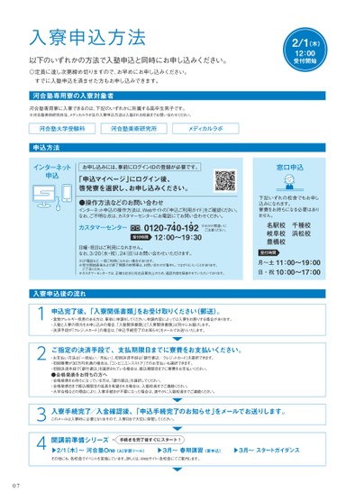 入寮申込方法以下のいずれかの方法で入塾申込と同時にお申し込みください。◎定員に達し次第締め切りますので、お早めにお申し込みください。すでに入塾申込を済ませた方もお申し込みできます。河合塾専用寮の入寮対象者河合塾専用寮に入寮できるのは、下記のいずれかに所属する高卒生男子です。※河合塾美術研究所生、メディカルラボ生の入寮申込方法は入塾される校舎までお問い合わせください。河合塾大学受験科河合塾美術研究所メディカルラボ申込方法インターネット申込お申し込みには、事前にログインIDの登録が必要です。「申込マイページ」にログイン後、啓発寮を選択し、お申し込みください。●操作方法などのお問い合わせインターネット申込の操作方法は、Webサイトの「申込ご利用ガイド」をご確認ください。なお、ご不明な点は、カスタマーセンターにお電話にてお問い合わせください。・・0120-740-19212:00~19:30受付時間カスタマーセンターⓇ※おかけ間違いにご注意ください。日曜・祝日はご利用になれません。なお、3/20(水・祝)、24(日)はお問い合わせいただけます。※ⅠP電話など、一部ご利用になれない場合があります。※受付開始直後および終了間際の時間帯は、お問い合わせが集中し、つながりにくいことがあります。ご了承ください。※カスタマーセンターでは、正確な応対と対応品質向上のため、通話内容を録音させていただいております。2/1(木)12:00受付開始窓口申込下記いずれの校舎でもお申し込みになれます。寮費をお持ちになる必要はありません。名駅校千種校岐阜校浜松校豊橋校受付時間月~土11:00~19:00日・祝10:00~17:00入寮申込後の流れ1申込完了後、「入寮関係書類」をお受け取りください(郵送)。・食物アレルギー疾患のある方は、事前に申請をしてください。申請内容によっては入寮をお断りする場合があります。・入塾と入寮の両方をお申し込みの場合、入塾関係書類」と「入寮関係書類」は別々にお届けします。・決済手段が「クレジットカード」の場合は、申込手続完了のお知らせ」をメールでお送りいたします。ご指定の決済手段で、支払期限日までに寮費をお支払いください。2・お支払い方法は「一括払い/月払い」、初回決済手段は「銀行振込/クレジットカード」を選択できます。・初回寮費が30万円未満の場合は、コンビニエンスストア」でのお支払いも選択できます。・初回決済手段で「銀行振込」を選択されている場合は、振込期限日までに寮費をお支払いください。●合格発表をお待ちの方へ・合格発表をお待ちになっている方は、銀行振込」を選択してください。・合格発表日まで振込期限日の延長を希望される場合は、入塾校舎までご連絡ください。・大学合格などの理由により、入寮手続きが不要になった場合は、速やかに入塾校舎までご連絡ください。このメールは入寮時に必要となりますので、入寮日まで大切に保管してください。3入寮手続完了/入金確認後、「申込手続完了のお知らせ」をメールでお送りします。4開講前準備シリーズ▶2/1(木)~河合塾One(AⅠ学習ツール)▶3月~春期講習(要申込)▶3月~スタートガイダンス手続きを完了後すぐにスタート!その他にも、各校舎でイベントを実施しています。詳しくは、Webサイト・各校舎にてご案内します。07