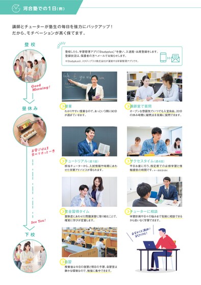 講師とチューターが塾生の毎日を強力にバックアップ!だから、モチベーションが高く保てます。登校したら、学習管理アプリ「Studyplus」※を使い、入退館・出席登録をします。登録状況は、保護者の方へメールでお知らせします。※Studyplusは、スタディプラス株式会社が運営する学習管理アプリです。登校GoodMorning!昼休み授業わかりやすい授業なので、あっという間に90分が過ぎていきます。講師室で質問オープンな雰囲気でいつでも入室自由。20分の休み時間に疑問点を気軽に質問できます。チュートリアル(週1回)担当チューターから、入試情報や時期にあわせた学習アドバイスが得られます。サクセスタイム(週4回)平日お昼に行う、指定席での必修学習と情報提供の時間です。※一部校舎を除くSeeYou!下校完全習得タイム習熟度にあわせた問題演習に取り組むことで、確実に学びが定着します。チューターに相談学習計画や日々の悩みまで気軽に相談できるから迷いなく学習できます。自習授業後は今日の復習と明日の予習。自習室は静かな環境なので、勉強に集中できます。