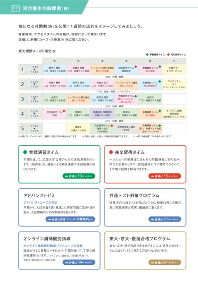 気になる時間割(例)を公開!1週間の流れをイメージしてみましょう。授業時間、サクセスタイムの実施は、校舎によって異なります。詳細は、別冊「コース・学費案内」をご覧ください。東大理類コースの場合(例)123459:1010:4011:0012:3013:4015:1015:3017:0017:2018:50,実戦演習タイム完全習得タイム年間を通して、志望大学合格のための実戦演習を行います。演習後には、講師による解説講義や添削指導が受けられます。一人ひとりの習熟度にあわせた問題演習に取り組み、学びを定着させます。担当講師にすぐ質問できるので、その場で疑問を解消できます。詳細は13ページへ詳細は15ページへアドバンストゼミアドバンストコース生限定早期から、入試本番を強く意識した演習問題に数多く取り組み、入試突破のための実戦力を鍛えます。詳細は別冊「コース・学費案内」へ共通テスト対策プログラム授業内の共通テスト対策だけでなく、授業以外にも質の高い問題演習が充実。徹底的に鍛えます。詳細は11ページへオンライン講師個別指導オンライン講師個別指導プラスコース生対象講師がキミの専属コーチになり、年間を通して、丁寧な個別指導を行います。※オプション講座として受講も可能です。各科目週1回45分(年間35回)詳細は19ページへ東大・京大・医進合格プログラム東大・京大・医学部医学科をめざす方には、通常のカリキュラムに加えて、さらに特別なプログラムがあります。詳細は9ページへ