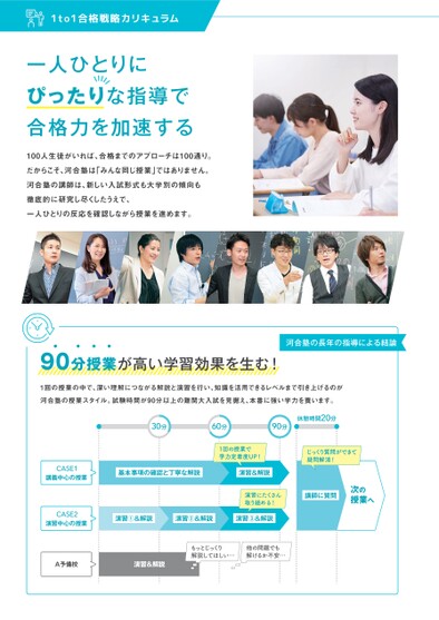 一人ひとりにぴったりな指導で合格力を加速する100人生徒がいれば、合格までのアプローチは100通り。だからこそ、河合塾は「みんな同じ授業」ではありません。河合塾の講師は、新しい入試形式も大学別の傾向も徹底的に研究し尽くしたうえで、一人ひとりの反応を確認しながら授業を進めます。90分授業が高い学習効果を生む!河合塾の長年の指導による結論1回の授業の中で、深い理解につながる解説と演習を行い、知識を活用できるレベルまで引き上げるのが河合塾の授業スタイル。試験時間が90分以上の難関大入試を見据え、本番に強い学力を養います。30分60分90分休憩時間20分1回の授業で学力定着度UP!じっくり質問ができて疑問解消!基本事項の確認と丁寧な解説演習&解説演習にたくさん取り組める!講師に質問次の授業へ演習①&解説演習②&解説演習③&解説CASE1講義中心の授業CASE2演習中心の授業A予備校演習&解説もっとじっくり解説してほしい…他の問題でも解けるか不安…