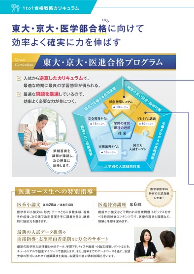 東大・京大・医学部合格に向けて効率よく確実に力を伸ばすSpecialCurriculum東大・京大・医進合格プログラムながらの実戦演習医学部医学科特有の入試対策も充実!述対策述・論い記プレミアム講義10ページへ本番さ度の高精習演問良添削指導システム10ページへ完全習得タイム15ページへ学問の本質・原理の理解授業実戦演習タイム13ページへ国立大入試オープン大学別の入試傾向対策入試から逆算したカリキュラムで、最適な時期に最良の学習効果が得られる。最適な問題を厳選しているので、く。効率よく必要な力が身につ得るえ鍛を力点厳選された発展演習を認添削答案講師が確し、にす次の授業反映しま。医進コース生への特別指導医系小論文年間28講/添削14回医進特別講座年6回医学科の小論文は、形式・テーマともに多種多様。答案を作成後、次の講で添削答案を手に講義を受け、継続的に論述力を磨きます。面接や小論文などで問われる医療問題・トピックスを学べる特別映像コンテンツです。医療の現状と課題など、理解と考察を深めます。最新の入試データ提供や面接指導・志望理由書添削など万全のサポート最新の医学科入試情報と分析データ、学習アドバイスや面接・小論文対策レポートなどを、チュートリアルや塾生マイページで提供します。また、前年までのデータベースを基に、志望大学の形式にあわせて模擬面接を実施。志望理由書の添削指導も行います。