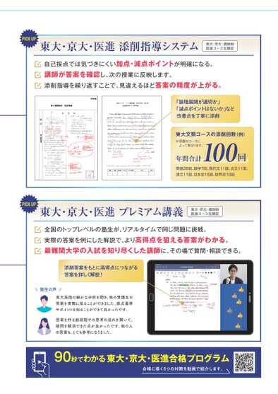 PICKUP東大・京大・医進添削指導システム東大・京大・選抜制医進コース生限定自己採点では気づきにくい加点・減点ポイントが明確になる。講師が答案を確認し、次の授業に反映します。添削指導を繰り返すことで、見違えるほど答案の精度が上がる。「論理展開が適切か」「減点ポイントはないか」など改善点を丁寧に添削東大文類コースの添削回数(例)100回※回数はコースによって異なります。年間合計英語28回、数学7回、現代文11回、古文11回、漢文11回、日本史16回、世界史16回PICKUP東大・京大・医進プレミアム講義東大・京大・選抜制医進コース生限定全国のトップレベルの塾生が、リアルタイムで同じ問題に挑戦。実際の答案を例にした解説で、より高得点を狙える答案がわかる。最難関大学の入試を知り尽くした講師に、その場で質問・相談できる。添削答案をもとに高得点につながる答案を詳しく解説!\塾生の声/東大英語の細かな分析を聞き、他の受講生の答案を実際に見ることができました。採点基準やポイントを知ることができて良かったです。答案を作る前段階での思考の流れを聞いて、疑問を解消できた点が良かったです。他の人の答案も、とても参考になりました。90秒でわかる東大・京大・医進合格プログラム合格に導く5つの対策を動画で紹介します。