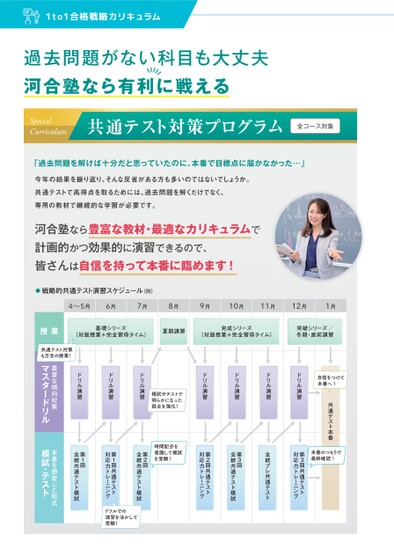 SpecialCurriculum共通テスト対策プログラム全コース対象「過去問題を解けば十分だと思っていたのに、本番で目標点に届かなかった…」今年の結果を振り返り、そんな反省がある方も多いのではないでしょうか。共通テストで高得点を取るためには、過去問題を解くだけでなく、専用の教材で継続的な学習が必要です。河合塾なら豊富な教材・最適なカリキュラムで計画的かつ効果的に演習できるので、皆さんは自信を持って本番に臨めます!●戦略的共通テスト演習スケジュール(例)4〜5月6月7月8月9月10月11月12月1月授業基礎シリーズ(対面授業+完全習得タイム)夏期講習完成シリーズ(対面授業+完全習得タイム)突破シリーズ/冬期・直前講習自信をつけて本番へ!ドリル演習共通テスト本番本番のつもりで最終確認!第3回共通テスト対応力トレーニングドリル演習全統プレ共通テストドリル演習ドリル演習第3回全統共通テスト模試第2回共通テスト対応力トレーニング模試やテストで明らかになった弱点を強化!時間配分を意識して模試を受験!ドリル演習ドリル演習ドリル演習ドリルでの演習を活かして受験!第2回全統共通テスト模試第1回共通テスト対応力トレーニング第1回全統共通テスト模試共通テスト対策も万全の授業!豊富な傾向対策マスタードリル本番を想定した形式模試・テスト過去問題がない科目も大丈夫河合塾なら有利に戦える