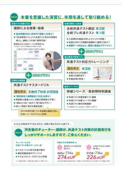PICKUP本番を意識した演習に、年間を通して取り組める!共通テスト対策も万全講師による授業・指導●過去問題のない科目や「情報Ⅰ」も安心!●「完全習得タイム」でも共通テスト形式の問題を導入し、講師にその場で質問可能!難関国公立大理系コースの時間割(例)※共通テスト形式の問題を扱う授業のみ抜粋月火水木金12345現代文完全習得タイム古文チュートリアル・サクセスタイム完全習得タイム漢文情報Ⅰ公共,政治・経済完全習得タイムさらにプラス!圧倒的な演習量共通テストマスタードリル塾生限定5教科7科目計99回●「歴史総合」地理総合」公共」も安心!●問題数が豊富だから、市販の問題集は不要!●1回あたり20〜25分で、取り組みやすい!●詳しい解説で弱点を徹底克服!2025年度共通テスト本試験も徹底分析し、完成シリーズのドリルに反映!本番を想定した形式全統共通テスト模試年3回全統プレ共通テスト年1回●入試傾向を徹底分析したオリジナル問題!●志望大学までの距離を客観的に確認できます!●成績データをもとに、個別に最適なアドバイス!さらにプラス!塾生限定の特別テスト共通テスト対応力トレーニング塾生限定年3回●本番さながらの出題で実戦力を磨きます!●学習成果を実感!最終リハーサル突破シリーズ/直前期特別講座●共通テスト本番突破テスト講座●共通テスト本番リハーサル講座※●共通テスト傾向対策講座※※冬期講習のため、別途申込・受講料が必要です。たくさんの教材をやりきれるのか、点数が伸びるのか心配です。PICKUP河合塾のチューター・講師が、共通テスト対策の計画実行をしっかりサポートしますので、ご安心ください。北海道大学総合入試理系M.Mさん合格510点226点736点UP460点274点734点UP※2023年度第1回全統共通テスト模試→2024年度大学入学共通テストの成績より算出横浜国立大学経済学部M.Hさん合格先輩たちの成績伸長(例)チューターによる共通テスト対策サポートの一例●マスタードリル実行計画の提示●模試受験前後のアドバイス●サクセスタイム※でのドリルの実施※一部校舎を除く。実施内容は校舎により異なります。