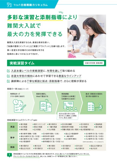 多彩な演習と添削指導により難関大入試で最大の力を発揮できる難関大入試を突破するため、最適な教材を使い、「知識の習得(インプット)」と「演習(アウトプット)」を繰り返します。第一志望大学合格のための強固な学力を効果的に身につけることができます。実戦演習タイム志望大学対策・実戦演習入試本番レベルの実戦演習に、年間を通して取り組める志望大学別の傾向にあわせて学習できる豊富なラインアップ講師陣による丁寧な解説と採点・添削指導で、さらに理解が深まる授業の一例(完成シリーズ)時間を計ってテストを解く(60分)答案を撮影しWebで提出する解説講義[対面または映像]を受講する(30分)採点・添削済み答案を受け取り復習する実戦演習タイムのラインアップ(抜粋)自分の志望大学の入試を知り尽くした講師による解説だから、得点に直結!英語数学国語ⅢⅡⅢⅡⅢⅡⅢⅡⅢⅡⅢⅡⅢⅡⅡ実戦演習タイムでも十分な実戦演習に取り組めますが、さらに高いレベルの演習を増やしたい方には、アドバンストコースがおすすめです。詳しくは、別冊「コース・学費案内」をご覧ください。