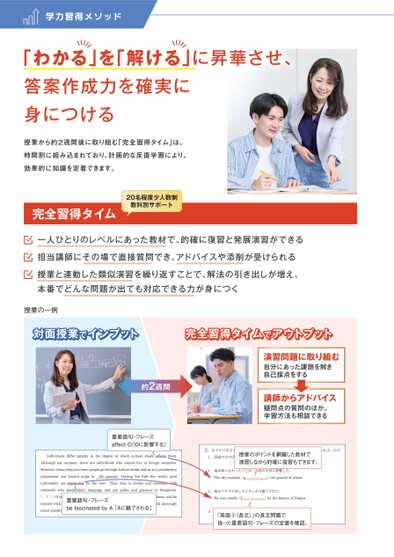 「わかる」を「解ける」に昇華させ、答案作成力を確実に身につける授業から約2週間後に取り組む「完全習得タイム」は、時間割に組み込まれており、計画的な反復学習により、効果的に知識を定着できます。完全習得タイム20名程度少人数制教科別サポート一人ひとりのレベルにあった教材で、的確に復習と発展演習ができる担当講師にその場で直接質問でき、アドバイスや添削が受けられる授業と連動した類似演習を繰り返すことで、解法の引き出しが増え、本番でどんな問題が出ても対応できる力が身につく授業の一例対面授業でインプット対面授業でインプット完全習得タイムでアウトプット完全習得タイムでアウトプット約2週間重要語句・フレーズaffectO「Oに影響する」演習問題に取り組む自分にあった課題を解き自己採点をする講師からアドバイス疑問点の質問のほか、学習方法も相談できる授業のポイントを網羅した教材で演習しながら的確に復習もできます。重要語句・フレーズbefascinatedbyA「Aに魅了される」「英語③(長文)」の長文問題で扱った重要語句・フレーズの定着を確認。