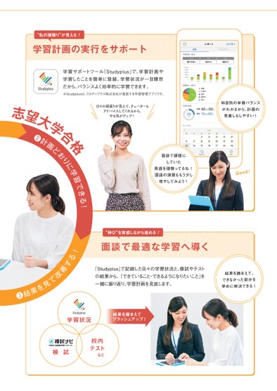 日々の頑張りが見えて、チューターもアドバイスしてくれるから、やる気がアップ!科目別の学習バランスがわかるから、計画の見直しもしやすい!面談で課題にしていた英語を頑張ってるね!国語の演習ももう少し増やしてみよう!Good!きる!習で格画どおりに学学合志望大❷計“伸び”を実感しながら進める!面談で最適な学習へ導く「Studyplus」で記録した日々の学習状況と、模試やテストの結果から、「できていること・できるようになりたいこと」を一緒に振り返り、学習計画を見直します。結果を踏まえて、できなかった部分を早めに解決できる!!るす善改て見を果結❸学習状況結果を踏まえてブラッシュアップ!模試校内テストなど“私の頑張り”が見える!学習計画の実行をサポート学習サポートツール「Studyplus」で、学習計画や学習したことを簡単に登録。学習状況が一目瞭然だから、バランスよく効率的に学習できます。※Studyplusは、スタディプラス株式会社が運営する学習管理アプリです。