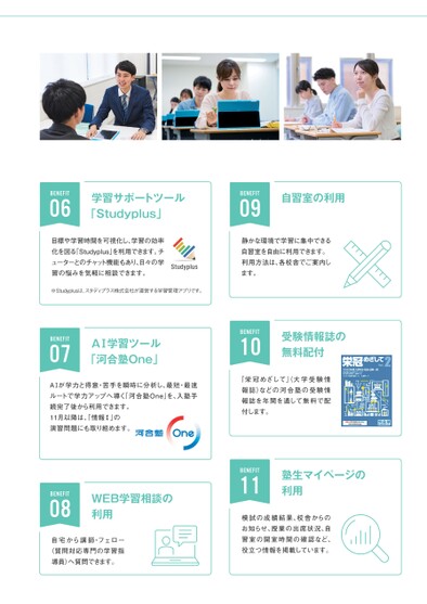 BENEFIT06学習サポートツール「Studyplus」BENEFIT09自習室の利用目標や学習時間を可視化し、学習の効率化を図る「Studyplus」を利用できます。チューターとのチャット機能もあり、日々の学習の悩みを気軽に相談できます。※Studyplusは、スタディプラス株式会社が運営する学習管理アプリです。静かな環境で学習に集中できる自習室を自由に利用できます。利用方法は、各校舎でご案内します。BENEFIT07AⅠ学習ツール「河合塾One」AⅠが学力と得意・苦手を瞬時に分析し、最短・最速ルートで学力アップへ導く「河合塾One」を、入塾手続完了後から利用できます。11月以降は、情報」の演習問題にも取り組めます。BENEFIT10受験情報誌の無料配付「栄冠めざして」(大学受験情報誌)などの河合塾の受験情報誌を年間を通して無料で配付します。BENEFIT08WEB学習相談の利用自宅から講師・フェロー(質問対応専門の学習指導員)へ質問できます。BENEFIT11塾生マイページの利用模試の成績結果、校舎からのお知らせ、授業の出席状況、自習室の開室時間の確認など、役立つ情報を掲載しています。