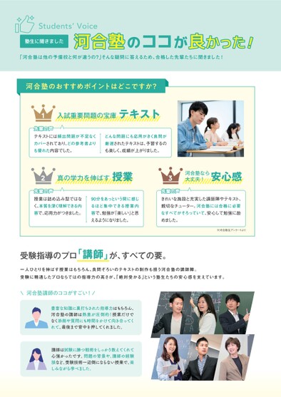 Students’Voice「河合塾は他の予備校と何が違うの?」そんな疑問に答えるため、合格した先輩たちに聞きました!河合塾のおすすめポイントはどこですか?1入試重要問題の宝庫テキストテキストには頻出問題が不足なくカバーされており、どの参考書よりも優れた内容でした。どんな問題にも応用がきく良問が厳選されたテキストは、予習するのも楽しく、成績が上がりました。2真の学力を伸ばす授業授業は詰め込み型ではなく、本質を深く理解できる内容で、応用力がつきました。90分をあっという間に感じるほど集中できる授業内容で、勉強が「楽しい」と思えるようになりました。3河合塾なら大丈夫!安心感きれいな施設と充実した講師陣やテキスト、親切なチューター。河合塾には合格に必要なすべてがそろっていて、安心して勉強に励めました。※河合塾生アンケートより受験指導のプロ「講師」が、すべての要。一人ひとりを伸ばす授業はもちろん、良問ぞろいのテキストの制作も担う河合塾の講師陣。受験に精通したプロならではの指導力の高さが、「絶対受かる」という塾生たちの安心感を支えています。\河合塾講師のココがすごい!/豊富な知識に裏打ちされた指導力はもちろん、河合塾の講師は熱意が圧倒的!授業だけでなく添削や質問にも時間をかけて向き合ってくれて、最後まで背中を押してくれました。講師は試験に勝つ戦術をしっかり教えてくれて心強かったです。問題の背景や、講師の経験談など、受験技術一辺倒にならない授業で、楽しみながら学べました。