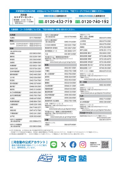 大学受験科の申込手続・お支払いについてのお問い合わせは、下記フリーダイヤルにご連絡ください。河合塾カスタマーセンター受付時間12:00〜19:30※日祝および12/31〜1/3は受付を行いません。関東の校舎に入塾希望の方関東以外の校舎に入塾希望の方0120-43●2-71●90120-74●0-19●2入塾相談・コースの内容については、下記の各校舎にお問い合わせください。北海道札幌校東北仙台校2025年2月28日まで2025年3月1日から関東〈東大専門特化校舎〉本郷校麹町校新宿校池袋校秋葉原館*自由が丘校吉祥寺現役館*調布現役館*立川校町田校厚木現役館*藤沢館*横浜校あざみ野現役館*金沢文庫現役館*大宮校南浦和現役館*川越現役館*柏校津田沼校千葉現役館*水戸校MEPLO池袋教室*(東大現役進学塾)MEPLO本郷教室(東大現役進学塾)(011)708-8581(022)215-5111(022)215-5112(03)5803-0581(03)3230-1581(03)3362-6581(03)3988-0581(03)5825-1581(03)5726-3261(0422)23-6581(042)440-2581(042)526-0581(042)724-7581(046)227-6581(0466)50-2581(045)312-6581(045)905-2581(045)782-7581(048)647-0581(048)884-7581(049)229-1005(04)7168-2271(047)473-7581(043)241-3581(029)302-6581(03)3988-6731(03)5803-0584MEPLO表参道教室*(東大現役進学塾)MEPLO横浜教室*(東大現役進学塾)(03)5778-9480(045)316-6581www.kawai-juku.ac.jp/wins/kanto/(03)5331-7581(03)3367-2581(03)3830-1371(03)3813-4581COSMO東京校美術研究所新宿校海外帰国生コースK会河合塾Wins(難関高校進学教室)*教室所在地・お問い合わせ先はWebサイトにてご確認ください。東海名駅校千種校星ヶ丘現役館*岐阜校浜松校豊橋校刈谷現役館*岡崎現役館*豊田現役館*四日市現役館*津現役館*美術研究所名古屋校小学・中学グリーンコース教室所在地・お問い合わせ先はWebサイトにてご確認ください。河合塾Wins(難関公立高校進学教室)*教室所在地・お問い合わせ先はWebサイトにてご確認ください。近畿大阪北キャンパス大阪校(052)451-0581(052)735-1588(052)782-0581(058)264-5581(053)453-5581(0532)54-0581(0566)21-3581(0564)54-3581(0565)32-5581(059)350-4581(059)226-0581(052)735-1596www.kawai-juku.ac.jp/jhreen/tokai/www.kawai-juku.ac.jp/wins/tokai/(06)6375-8581(06)6372-3592(06)6774-2581(06)6776-0581(075)252-0581(078)251-1715(06)6842-3581(072)686-6788(072)225-6072(072)436-8581(0742)30-0581(0744)29-3581(06)6372-5124大阪北キャンパス東大・京大・医進館(高卒生専用校舎)上本町校天王寺校京都校神戸三宮校現役生教室豊中*現役生教室高槻*現役生教室堺東*現役生教室岸和田*現役生教室西大寺*現役生教室八木*サポートコース梅田中学グリーンコース校舎所在地・お問い合わせ先はWebサイトにてご確認ください。中・四国広島校中学グリーンコース校舎所在地・お問い合わせ先はWebサイトにてご確認ください。www.kawai-juku.ac.jp/jhreen/hiroshima/九州福岡校北九州現役館*中学グリーンコース校舎所在地・お問い合わせ先はWebサイトにてご確認ください。河合塾マナビス校舎所在地はWebサイトにてご確認ください。(092)714-0581(093)330-6581www.kawai-juku.ac.jp/jhreen/fukuoka/www.kawai-juku.ac.jp/jhreen/kinki/(082)263-8581www.manavis.com/(03)3512-5771※(学)河合塾主催。*の校舎は(株)河合塾進学研究社主催の校舎です。河合塾マナビス各校舎の主催者は、各校舎へ直接お電話などでお問い合わせいただくか、河合塾マナビスのWebサイトでご確認ください。※「現役館」は登録商標です。※おかけ間違いにご注意ください。ⅠP電話など一部ご利用になれない場合があります。河合塾SNS公式アカウントはこちらから▶