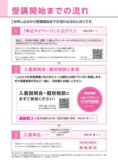 受講開始までの流れお申し込みから受講開始までの流れは次のとおりです。STEP1「申込マイページ」にログイン詳細は14ページ過去に、河合塾の模試・講習・入塾などのインターネット申込をされたことがある方は、お持ちのログインⅠDでお申し込みください。「申込マイページ」のご利用には、生徒ご本人のログインⅠDの登録が必要です。ログインⅠDをお持ちでない方は、事前にログインⅠDを登録いただくと、お手続きがスムーズに行えます。※ログインⅠDを登録される際には、Web画面に表示される「個人情報保護に関する事項」をよく読み、同意のうえでお申し込みください。申込ご利用ガイドはこちら▶STEP2入塾説明会・個別相談に参加一人ひとりの学習課題にあわせたコース選択と合格プランをご提案します。ぜひ保護者等の方もご一緒に、お気軽にお越しください。入塾説明会・個別相談にまずご参加ください!日程・会場・申込方法などの詳細はこちら▶参加特典入塾金10万円のうち5万円免除になります。選抜制コースを希望の方のみ:認定の確認・取得詳細は3・4ページSTEP3入塾申込保護者等の方の同意とログインⅠDの登録が必要です「申込マイページ」にログインのうえ、お申し込みください。14〜22ページ「申込操作ガイド」もあわせてご覧ください。詳細は5・6ページインターネット校舎窓口【申し込みのご本人・保護者等の皆様】2022年4月1日の民法改正で成年年齢が引き下げとなりましたが、弊塾[(株)河合塾進学研究社含む]では満18歳以上の方の入塾のお申し込みに際して、学費等をご負担いただく保護者等の方の同意を確認のうえ、お手続きいただきます。