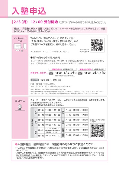 入塾申込2/3(月)12:00受付開始以下のいずれかの方法でお申し込みください。過去に、河合塾の模試・講習・入塾などのインターネット申込をされたことがある方は、お持ちのログインⅠDでお申し込みください。インターネット申込Webサイト「申込マイページ」にログイン後、「入塾(講座・コース)・講習・寮を申し込む」からご希望のコースを選択し、お申し込みください。※入塾金免除については、7ページをご覧ください。インターネット申込はこちら▶●操作方法などのお問い合わせインターネットの操作方法は、Webサイトの「申込ご利用ガイド」をご確認ください。なお、ご不明な点は、カスタマーセンターにお電話にてお問い合わせください。カスタマーセンター関東の校舎に入塾希望の方0120-4342-7149※おかけ間違いにご注意ください。Ⓡ関東以外の校舎に入塾希望の方0120-7440-1942Ⓡ受付時間12:00〜19:30日曜・祝日は受付を行いません。なお、3/20(木・祝)はお問い合わせいただけます。※ⅠP電話など、一部ご利用になれない場合があります。※受付開始直後および終了間際の時間帯は、お問い合わせが集中し、つながりにくいことがあります。ご了承ください。※カスタマーセンターでは、正確な応対と対応品質向上のため、通話内容を録音させていただいております。各校舎へのアクセスはこちら▶月〜土11:00〜19:00日・祝10:00〜17:00月〜土11:30〜19:30日・祝11:30〜17:00月〜土10:00〜18:00日・祝10:00〜17:00東海近畿広島・福岡月〜土11:00〜19:00日・祝10:00〜17:00月〜土10:00〜18:00日・祝10:00〜17:00月〜土11:00〜19:00※秋葉原館・藤沢館のみ10:00〜21:00日・祝10:00〜17:00札幌仙台受付時間関東窓口申込チューター(進学アドバイザー)が、一人ひとりにあった最適なコースをご提案します。河合塾各校舎でお申し込みできます。学費をお持ちになる必要はありません。●入塾説明会・個別相談には、保護者等の方もぜひご参加ください。・一人ひとりの学習課題にあわせたコース選択と合格プランをご提案します。ぜひ保護者等の方もご一緒にお越しください。・入塾申込の手続完了には、保護者等の方の同意とログインⅠDの登録および保護者等の方のメールアドレスに届く確認番号の入力が必要です。スマートフォンなどで受信できるメールアドレスをご用意いただくと、その場でスムーズに入塾申込ができます。
