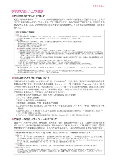 学費の支払い学費お支払い上の注意●初回学費のお支払いについて初回学費の決済手段は、「クレジットカード」「銀行振込」のいずれかの決済手段から選択できます。学費が30万円未満の場合は「コンビニエンスストア」も選択できます。画面の案内をご確認のうえ、お手続きをお願いいたします。なお、河合塾校舎窓口ではお支払いになれません。各決済手段の注意事項は、以下をご覧ください。【各決済手段の注意事項】●クレジットカード●銀行振込・ご利用可能なカードの種類は、Visa、MasterCard、JCB、AMERICANEXPRESS、DinersClubinternational、Discoverです。・ご利用代金明細書には、「学校法人河合塾」または「ガッコウホウジンカワイジュク」と表示されます。・振込用紙の送付はございません。お支払いに必要な口座番号等は申込マイページにてご確認ください。・振込手数料はお客様負担となります。・振込口座番号はお申し込みごとに異なります。・校舎窓口ではお支払いになれません。■金融機関での学費などのお振り込みについて金融機関でのお振り込みに際しては、次の点にご留意くださいますようお願いいたします。①金融機関の窓口で10万円を超える現金でのお振り込みの場合は、お手続きを行う方の本人確認書類(運転免許証など)が必要です。学費などのお振り込みをご本人に代わって保護者等の方が行う場合は、円滑にお手続きを進めるために、生徒ご本人の確認書類もご用意されることをおすすめします。また、本人確認に加え、職業や取引目的などの確認(取引時確認)が必要となる場合があります。詳細は、各金融機関窓口へお問い合わせください。②ATMでは、10万円を超える現金でのお振り込みができませんのでご注意ください。③預貯金口座からお振り込みを行う場合は、ATM・窓口いずれにおいてもご本人確認は不要です。④ゆうちょ銀行からは、現金によるお振り込みができません。詳細は、ゆうちょ銀行窓口へお問い合わせください。・お支払い可能なコンビニエンスストアは、セブン-イレブン、ローソン、ファミリーマート、ミニストップ、セイコーマート、デイリー●コンビニエンスストアヤマザキです。・お支払い合計金額が30万円以上の場合は、コンビニエンスストアでのお支払いはご利用になれません。・お支払い手続きの方法は、各コンビニエンスストアで異なります。●次回以降決済手段の登録について学費の支払方法[一括払い・分割払い(2回)]にかかわらず、次回以降のお支払いには決済手段の登録をお願いしております。次回以降の決済手段は「クレジットカード」「口座振替」「Pay-easy(ペイジー)」の3つの手段から登録できます。初回支払いに「クレジットカード」を指定された場合、次回以降も自動でクレジットカード情報が登録されます。決済手段の変更は、申込マイページから変更をお願いいたします。ご登録の決済手段から、下記の①〜⑤の決済をいたします。①学費の支払方法で分割払い(2回)を選択した場合の2回目の授業料②オプション講座の授業料③受講コースの変更による差額請求④春期講習、夏期講習、冬期・直前講習の受講料⑤ご登録の決済手段を前提として受け付けする河合塾指定の商品(有料イベント料金・再発行などの各種料金)ジからお手続きをお願いいたします。※返金が生じた場合、メールでお知らせいたします。[【河合塾】返金手続(返金口座登録)のご案内]メールをご確認のうえ、申込マイペー※クレジットカード情報または振替口座の登録が完了するまでは、「Pay-easy(ペイジー)」でのお支払いとなります。●ご請求・お支払いスケジュールについて受講コース変更時のご精算、春期講習、夏期講習、冬期・直前講習の受講料など、ご登録の決済手段を前提として受け付けする河合塾指定の商品は、発生時のみのご請求となります。ご請求月の7日頃に、[【河合塾】学費確定(月次精算)のご案内]メールをお送りいたします(メールの送信日は前後する場合があります)。【各決済手段のお支払いスケジュール】※ご請求・お支払いスケジュールは、一部変更となる場合があります。●クレジットカード●口座振替●Pay-easy(ペイジー)クレジットカードは毎月5日頃に精算のうえ、当月8日頃に決済いたします〔ただし、1月の決済日は2026/1/10(土)となります〕。何らかの理由により決済できなかった場合は、メールでお知らせし、17日、27日に再度自動で決済いたします。決済日はクレジットカードの支払日と同一ではありません。クレジットカードの支払日は、クレジットカード会社が定める引き落とし日となりますので、ご利用明細もしくはクレジットカード会社にご確認をお願いいたします。口座振替は毎月5日頃に精算のうえ、当月27日(土曜・日曜・祝日の場合は翌営業日)にご指定の銀行口座から振り替えます。Pay-easy(ペイジー)は毎月5日頃に精算いたします。当月27日(土曜・日曜・祝日の場合は翌営業日)までにお支払いください。お支払いに必要な「収納機