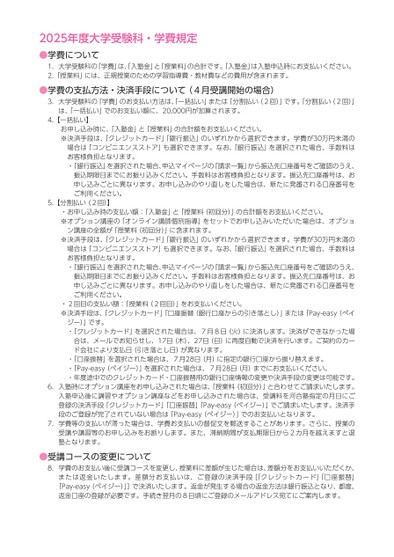 3.大学受験科の「学費」のお支払い方法は、一括払い」または「分割払い(2回)」です。「分割払い(2回)」は、「一括払い」でのお支払い額に、20,000円が加算されます。4.【一括払い】お申し込み時に、「入塾金」と「授業料」の合計額をお支払いください。※決済手段は、「クレジットカード」「銀行振込」のいずれかから選択できます。学費が30万円未満の場合は「コンビニエンスストア」も選択できます。なお、「銀行振込」を選択された場合、手数料はお客様負担となります。・「銀行振込」を選択された場合、申込マイページの「請求一覧」から振込先口座番号をご確認のうえ、振込期限日までにお振り込みください。手数料はお客様負担となります。振込先口座番号は、お申し込みごとに異なります。お申し込みのやり直しをした場合は、新たに発番される口座番号をご利用ください。5.【分割払い(2回)】・お申し込み時の支払い額:「入塾金」と「授業料(初回分)」の合計額をお支払いください。※オプション講座の「オンライン講師個別指導」をセットでお申し込みいただいた場合は、オプション講座の全額が「授業料(初回分)」に含まれます。※決済手段は、「クレジットカード」「銀行振込」のいずれかから選択できます。学費が30万円未満の場合は「コンビニエンスストア」も選択できます。なお、「銀行振込」を選択された場合、手数料はお客様負担となります。・「銀行振込」を選択された場合、申込マイページの「請求一覧」から振込先口座番号をご確認のうえ、振込期限日までにお振り込みください。手数料はお客様負担となります。振込先口座番号は、お申し込みごとに異なります。お申し込みのやり直しをした場合は、新たに発番される口座番号をご利用ください。・2回目の支払い額:「授業料(2回目)」をお支払いください。※決済手段は、「クレジットカード」「口座振替(銀行口座からの引き落とし)」または「Pay-easy(ペイジー)」です。2025年度大学受験科・学費規定●学費について1.大学受験科の「学費」は、入塾金」と「授業料」の合計です。「入塾金」は入塾申込時にお支払いください。2.「授業料」には、正規授業のための学習指導費・教材費などの費用が含まれます。●学費の支払方法・決済手段について(4月受講開始の場合)・「クレジットカード」を選択された場合は、7月8日(火)に決済します。決済ができなかった場合は、メールでお知らせし、17日(木)、27日(日)に再度自動で決済を行います。ご契約のカード会社により支払日(引き落とし日)が異なります。・「口座振替」を選択された場合は、7月28日(月)に指定の銀行口座から振り替えます。・「Pay-easy(ペイジー)」を選択された場合は、7月28日(月)までにお支払いください。・年度途中でのクレジットカード・口座振替用の銀行口座情報の変更や決済手段の変更は可能です。6.入塾時にオプション講座をお申し込みされた場合は、「授業料(初回分)」と合わせてご請求いたします。入塾申込後に講習やオプション講座などをお申し込みされた場合は、受講料を河合塾指定の月日にご登録の決済手段「クレジットカード」「口座振替」「Pay-easy(ペイジー)」でご請求いたします。決済手段のご登録が完了されていない場合は「Pay-easy(ペイジー)」でのお支払いとなります。7.学費等の支払いが滞った場合は、学費お支払いの督促文を郵送することがあります。さらに、授業の受講や講習等のお申し込みをお断りします。また、滞納期間が支払期限日から2カ月を越えますと退塾となります。●受講コースの変更について8.学費のお支払い後に受講コースを変更し、授業料に差額が生じた場合は、差額分をお支払いいただくか、または返金いたします。差額分お支払いは、ご登録の決済手段[「クレジットカード」「口座振替」「Pay-easy(ペイジー)」]で決済いたします。返金が発生する場合の返金方法は銀行振込となり、都度、返金口座の登録が必要です。手続き翌月の8日頃にご登録のメールアドレス宛てにご案内します。