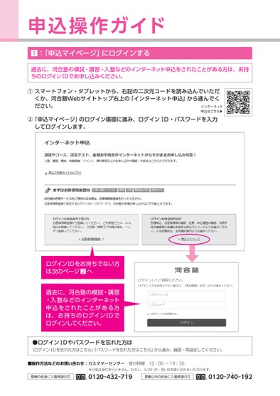 申込操作ガイド:「申込マイページ」にログインする過去に、河合塾の模試・講習・入塾などのインターネット申込をされたことがある方は、お持ちのログインⅠDでお申し込みください。①スマートフォン・タブレットから、右記の二次元コードを読み込んでいただくか、河合塾Webサイトトップ右上の「インターネット申込」から進んでください。インターネット申込はこちら▶②「申込マイページ」のログイン画面に進み、ログインⅠD・パスワードを入力してログインします。ログインⅠDをお持ちでない方は次のページへ過去に、河合塾の模試・講習・入塾などのインターネット申込をされたことがある方は、お持ちのログインⅠDでログインしてください。●ログインⅠDやパスワードを忘れた方は「ログインⅠDを忘れた方はこちら」「パスワードを忘れた方はこちら」から進み、確認・再設定してください。■操作方法などのお問い合わせ:カスタマーセンター受付時間12:00〜19:30※日祝は受付を行いません。ただし、3/20(木・祝)はお問い合わせいただけます。関東の校舎に入塾希望の方Ⓡ0120-4342-7149関東以外の校舎に入塾希望の方Ⓡ0120-7440-1942