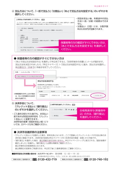 ④支払方法について、「一括で支払う」「分割払い」「あとで支払方法を設定する」のいずれかを選択してください。申込操作ガイド・初回お支払い後、年度途中の支払方法(一括/分割)の変更はできません。・分割払い(2回)には、分割手数料20,000円が加算されます。保護者等の方の確認がすぐにできない方は、「あとで支払方法を設定する」を選択してください。●保護者等の方の確認がすぐにできない方は・「あとで支払方法を設定する」を選択して申込完了すると、「決済手続きのお願い」メールが届きます。支払方法を決定されましたら、「申込マイページ」>「支払方法を設定する」に進み、支払方法を選択し、申込翌日23:59までに手続きを完了してください。※春期講習をお申し込みの場合は、先に大学受験科の決済手続きが必要です。⑤決済手段について、「クレジット支払い」「銀行振込」のいずれかを選択してください。・ご入塾を決定された後でも、お支払い前であれば初回決済手段を「クレジット支払い」に変更できます。決済手段の変更(初回お支払い前)については、22ページをご確認ください。合格発表待ち(席確保申込)の方は、『銀行振込』を選択してください。●決済手段選択時の注意事項・「クレジット支払い」を選択した場合、即時決済となります。ここで登録したクレジットカードが次回以降の決済手段に登録されます。決済手段の変更は申込マイページの「決済手段の登録・変更」から可能です。・「銀行振込」を選択した場合、振込用紙の送付はありません。申込マイページトップに表示される、「請求金額が確定しました」を選択し、「銀行振込」に必要な情報をご確認ください。振込手数料はお客様負担となります。振込期限日の変更をご希望の方は、申込完了後に入塾希望校舎にご連絡ください。■操作方法などのお問い合わせ:カスタマーセンター受付時間12:00〜19:30※日祝は受付を行いません。ただし、3/20(木・祝)はお問い合わせいただけます。関東の校舎に入塾希望の方Ⓡ0120-4342-7149関東以外の校舎に入塾希望の方Ⓡ0120-7440-1942