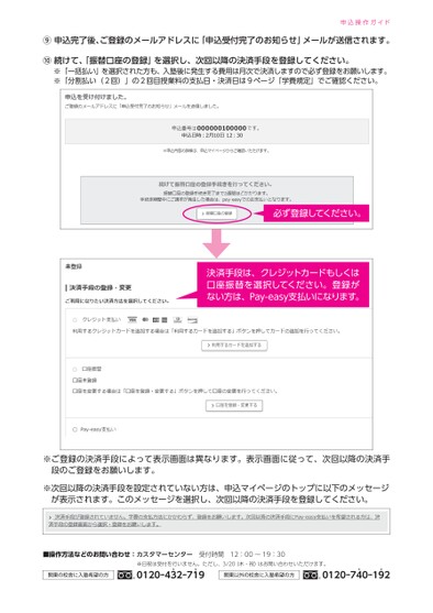 ⑨申込完了後、ご登録のメールアドレスに「申込受付完了のお知らせ」メールが送信されます。⑩続けて、「振替口座の登録」を選択し、次回以降の決済手段を登録してください。※「一括払い」を選択された方も、入塾後に発生する費用は月次で決済しますので必ず登録をお願いします。※「分割払い(2回)」の2回目授業料の支払日・決済日は9ページ「学費規定」でご確認ください。申込操作ガイド必ず登録してください。決済手段は、クレジットカードもしくは口座振替を選択してください。登録がない方は、Pay-easy支払いになります。※ご登録の決済手段によって表示画面は異なります。表示画面に従って、次回以降の決済手段のご登録をお願いします。※次回以降の決済手段を設定されていない方は、申込マイページのトップに以下のメッセージが表示されます。このメッセージを選択し、次回以降の決済手段を登録してください。■操作方法などのお問い合わせ:カスタマーセンター受付時間12:00〜19:30※日祝は受付を行いません。ただし、3/20(木・祝)はお問い合わせいただけます。関東の校舎に入塾希望の方Ⓡ0120-4342-7149関東以外の校舎に入塾希望の方Ⓡ0120-7440-1942