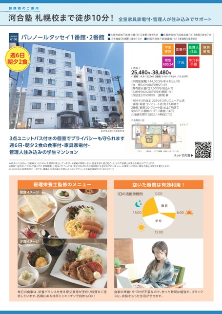 資料請求6106パレノールタッセイ1番館・2番館■札幌市営地下鉄南北線「北12条駅」徒歩5分■札幌市営地下鉄南北線「北18条駅」徒歩7分■JR千歳線「札幌駅」徒歩13分■札幌市営地下鉄東豊線「北13条東駅」徒歩8分週6日朝夕2食学生専用食事付緊急対応24IT光管理人住込仲介料不要家具家電[賃料]25,480円〜38,480円(1番館:14.8〜22.0㎡、2番館:14.6〜19.6㎡、1R、85戸)[年間管理費]144,000円/年※月払い可[食費]29,980円(税込)/月[専有部水道代]2,500円(税込)/月[入館金]80,000円(契約期間1年)[保証金]20,000円[損保]要1991年3月竣工2016年3月リニューアル済1番館:鉄筋コンクリート造地上6階建て2番館:鉄筋コンクリート造地上7階建て全85戸(1番館:51戸、2番館:34戸)北海道札幌市北区北14条西3丁目3点ユニットバス付きの個室でプライバシーも守られます週6日・朝夕2食の食事付・家具家電付・管理人住み込みの学生マンション【当学生会館との直接契約】ネットで内覧▶管理栄養士監修のメニュー空いた時間は有効利用!朝食イメージ1日の活動時間例0:00睡眠18:006:00学校12:00夕食イメージ毎日の食事は、栄養バランスを考え寮父寮母が手作り料理をご提供しています。各階にある共用ミニキッチンで自炊もOK!食事の準備・片づけが不要なので、余った時間は勉強や、リラックスに。余裕をもった生活ができます。