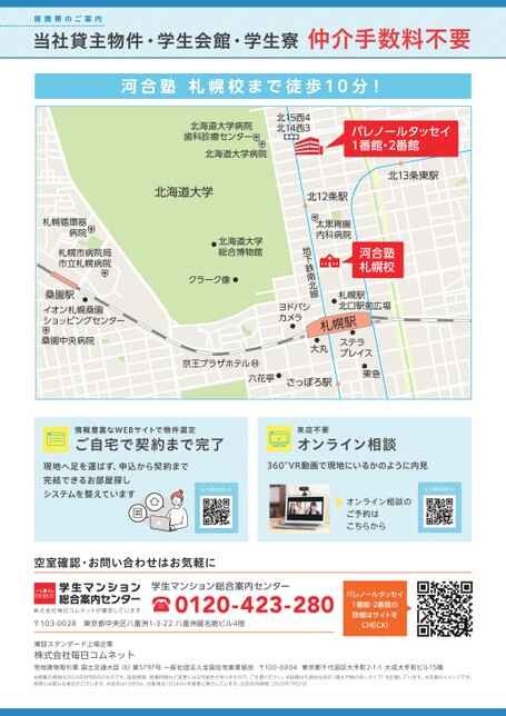 提携寮のご案内河合塾札幌校まで徒歩10分!北15西4北14西3北海道大学病院歯科診療センター北海道大学病院パレノールタッセイ1番館・2番館北13条東駅東北12条駅太黒胃腸内科病院河合塾札幌校札幌駅北口駅前広場札幌駅ステラプレイス地下鉄南北線ヨドバシカメラ北海道大学北海道大学総合博物館クラーク像大丸京王プラザホテル六花亭さっぽろ駅札幌循環器病院札幌市病院局市立札幌病院桑園駅イオン札幌桑園ショッピングセンター桑園中央病院東急サフ北海道庁赤レンガ来店不要テラスオンライン相談カナモトホール(札幌市民ホール)360°VR動画で現地にいるかのように内見札幌市時計台大通公園大通駅バスセンター前駅地CHECK!北海道大学植物園ご自宅で契約まで完了情報豊富なWEBサイトで物件選定北海道立現地へ足を運ばず、申込から契約まで近代美術館完結できるお部屋探しシステムを整えていますCHECK!空室確認・お問い合わせはお気軽にオンライン相談のご予約はこちらからパレノールタッセイ1番館・2番館の詳細はサイトをCHECK!株式会社毎日コムネットが運営しています〒103-0028東京都中央区八重洲1-3-22八重洲龍名館ビル4階学生マンション総合案内センター0120-423-280東証スタンダード上場企業株式会社毎日コムネット宅地建物取引業国土交通大臣(6)第5797号一般社団法人全国住宅産業協会〒100-0004東京都千代田区大手町2-1-1大成大手町ビル15階※掲載の情報は2024年8月時点のものです。施設情報、営業時間など変更になる可能性がありますので、ご注意ください。※設備は代表的な対応(最も戸数の多いタイプ)を記載しています。※写真はイメージです。実際とは異なる場合がございます。※徒歩は1分80m、自転車は1分240mを基準に算出しています。広告有効期限:2025年7月21日