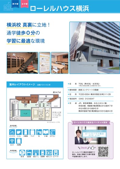 男子寮女子寮ローレルハウス横浜横浜校真裏に立地!通学徒歩0分の学習に最適な環境定員70名(男40名・女30名)*男女の定員は変更になる場合があります。建物概要鉄筋コンクリート9階建住所〒220-0004横浜市西区北幸2-11-39電話番号(045)312-6547交通JR、東急東横線、みなとみらい線、京急本線、相鉄線横浜駅西口から徒歩7分みなみ西口から徒歩6分横浜市営地下鉄横浜駅出口9から徒歩4分約14.7㎡男子寮と女子寮は、入口・生活スペースともに分かれています。下駄箱(傘立て)洗濯機冷蔵庫クローゼット棚※イラストはイメージです。ローレルハウス横浜をバーチャル見学(男子寮・女子寮)音読ルームローレルハウス横浜を動画でご案内。校舎に隣接する寮の居室や設備を紹介します。室内レイアウトイメージ全室バス・トイレ付本棚机カーテンイスベッドカーテン室内設備エアコンWi-Fi共同設備