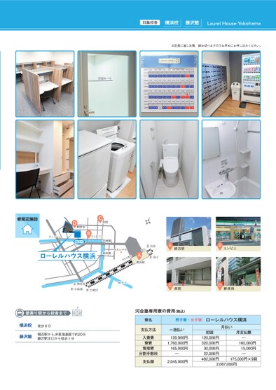 対象校舎横浜校藤沢館LaurelHouseYokohama※定員に達し次第、締め切りますのでお早めにお申し込みください。C病院ローレルハウス横浜内海橋南幸橋タカシマヤ口西みなみ至渋谷至品川口西A横浜駅A横浜駅Bコンビニ寮周辺施設D郵便局横浜校スーパーBコンビニ至海老名至小田原至三崎口帷子川C病院D郵便局最寄り駅から校舎まで横浜校徒歩0分藤沢館横浜駅からJR東海道線で約20分藤沢駅北口から徒歩1分河合塾専用寮の費用(税込)寮名男子寮・女子寮ローレルハウス横浜支払方法一括払い入寮費寮費管理費分割手数料120,000円1,760,000円165,000円―支払額2,045,000円初回120,000円320,000円30,000円22,000円492,000円月払い月支払額―160,000円15,000円―175,000円×9回2,067,000円