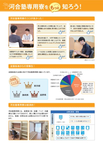 家と違って勉強に邪魔な物がないので、自分の部屋でも集中して勉強することができました。!odoG[寮生アンケートより]北海道地方1.6%東北地方7.2%関東地方36.9%通学圏内(東京都・埼玉県・神奈川県・千葉県)の方も、受験勉強に集中できる環境を求めて、多数入寮しています。中部地方27.5%【河合塾専用寮寮生出身地3カ年データ】2022-2024必要な家具・家電布団※布団のリースありその他、家具・家電は備えつけバス・トイレ別も魅力のひとつ!洗濯機冷蔵庫パソコン・タブレット炊飯器掃除機電子レンジベッド布団机・椅子台所用品本棚・収納カーテン照明ひとり暮らしではすべて自分で準備が必要です河合塾専用寮ひとり暮らし同じ目標を持った仲間と過ごすことで、切磋琢磨しながら勉強に取り組むことができました。!odoG寮生活を通じて、大学で勉強したいことや自分の将来像を思い描くことができ、勉強に対するモチベーションアップにもつながりました。!odoG自習室やフェロー制度、過去問題集などの学習環境が十分整っていて!とても良かったです。dGooいつも決まった時間に食事がとれるので、自然と規則正しい生活が送れました。ooGd!全国各地からの受験生!全国各地から合格に向けて河合塾専用寮に集まっています。その他4.2%出身地トップ3!1東京都九州地方9.8%四国地方5.0%中国地方5.0%近畿地方5.0%2静岡県3長野県河合塾専用寮は経済的!河合塾専用寮には、各寮室に机・本棚・ベッド・冷蔵庫など備えつけてあるので、新しく購入する必要はありません。勉強・日常生活に必要なものだけで入寮できます。河合塾専用寮をもっと知ろう!河合塾専用寮のココが良かった!