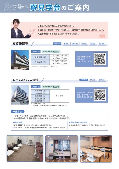 一度、寮を見てみませんか?寮見学会のご案内ご家族の方も一緒にご参加いただけます。下記日程に都合がつかない場合には、随時見学を受け付けておりますので、入塾を希望する校舎までお問い合わせください。東京飛躍寮対象校舎本郷校麹町校新宿校池袋校秋葉原館実施日程見学所要時間:約20分3月9日(日)3月16日(日)11:30〜12:3014:30〜17:0011:30〜12:3014:30〜17:00※上記時間内のご参加可能な時間にお越しください。東京飛躍寮の詳細、寮見学会のお申し込みはこちら▼ローレルハウス横浜対象校舎横浜校藤沢館実施日程見学所要時間:約20分2月8日(土)2月22日(土)3月2日(日)3月12日(水)3月15日(土)14:00ローレルハウス横浜の詳細、寮見学会のお申し込みはこちら▼※上記時間にお越しください。見学会の後、ご希望に応じて横浜校入塾説明会にご案内いたします。申込方法インターネット申込:上記各寮の二次元コードよりお申し込みください。窓口・電話申込:入塾を希望する校舎にお申し出ください(当日受付可)。●集合場所[東京飛躍寮]入口エントランス前にお集まりください。[ローレルハウス横浜]河合塾横浜校1階総合窓口前にお集まりください。●見学会当日の持ち物スリッパ(各自でご参加の人数分をご用意ください)