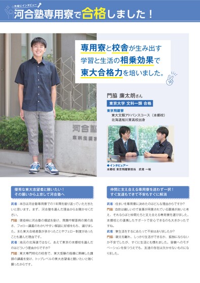 先輩にインタビュー河合塾専用寮で合格しました!専用寮と校舎が生み出す学習と生活の相乗効果で東大合格力を培いました。門脇廉太朗さん東京大学文科一類合格東京飛躍寮東大文類アドバンスコース(本郷校)北海道旭川東高校出身◆インタビュアー本郷校東京飛躍寮担当武者一裕優秀な東大志望者と競いたい!その願いから上京して河合塾へ仲間と支え合える専用寮を迷わず一択!すぐ友達もできて不安もすぐに解消武者:本日は河合塾専用寮での1年間を振り返っていただきたいと思います。まず、河合塾を選んだ理由からお聞かせください。門脇:現役時に河合塾の模試を受け、問題や解答例の質の良さ、フォロー講義のわかりやすい解説に好感をもち、選びました。また東大合格者数が多かったことやフェロー制度があったことも選んだ理由です。武者:地元の北海道ではなく、あえて東京の本郷校を選んだのはどういう理由からですか?門脇:東大専門特化の校舎で、東大受験の指導に熟練した講師の講義を受け、トップレベルの東大志望者と競いたいと強く願ったからです。武者:住まいを専用寮に決めたのはどんな理由からですか?門脇:自炊は厳しいので食事が用意されている環境が良いと考え、それならばと仲間たちと支え合える専用寮を選びました。本郷校との連携したサポートで安心できるのも大きかったですね。武者:寮生活をするにあたって不安はありましたか?門脇:親元を離れ、しっかり生活ができるか、孤独にならないか不安でしたが、すぐに生活にも慣れました。受験へのモチベーションを保つうえでも、友達の存在は欠かせないものになりました。