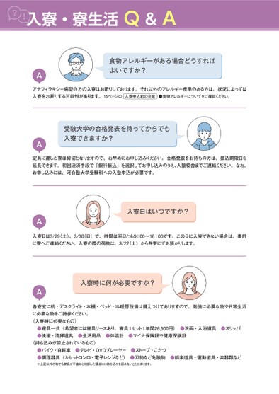 入寮・寮生活Q&AA食物アレルギーがある場合どうすればよいですか?アナフィラキシー病型の方の入寮はお断りしております。それ以外のアレルギー疾患のある方は、状況によっては入寮をお断りする可能性があります。15ページの●食物アレルギーについてをご確認ください。入寮申込前の注意受験大学の合格発表を待ってからでも入寮できますか?A定員に達した寮は締切となりますので、お早めにお申し込みください。合格発表をお待ちの方は、振込期限日を延長できます。初回決済手段で「銀行振込」を選択してお申し込みのうえ、入塾校舎までご連絡ください。なお、お申し込みには、河合塾大学受験科への入塾申込が必要です。A入寮日はいつですか?入寮日は3/29(土)、3/30日)で、時間は両日とも9:00〜16:00です。この日に入寮できない場合は、事前に寮へご連絡ください。入寮の際の荷物は、3/22(土)から各寮にてお預かりします。入寮時に何が必要ですか?A各寮室に机・デスクライト・本棚・ベッド・冷暖房設備は備えつけてありますので、勉強に必要な物や日常生活に必要な物をご持参ください。〈入寮時に必要なもの〉●寝具一式(希望者には寝具リースあり。寝具1セット1年間26,500円)●洗面・入浴道具●スリッパ●洗濯・清掃道具●生活用品●体温計●マイナ保険証や健康保険証〈持ち込みが禁止されているもの〉●バイク・自転車●テレビ・DVDプレーヤー●ストーブ・こたつ●調理器具(カセットコンロ・電子レンジなど)●刃物など危険物●娯楽道具・運動道具・楽器類など※上記以外の物でも寮長が不適切と判断した場合には持ち込みを認めないことがあります。