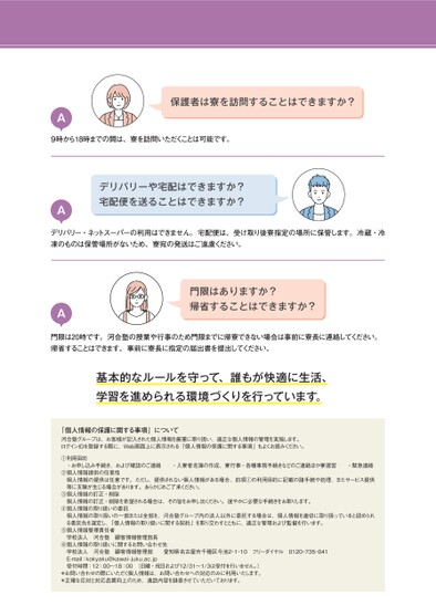 保護者は寮を訪問することはできますか?A9時から18時までの間は、寮を訪問いただくことは可能です。デリバリーや宅配はできますか?宅配便を送ることはできますか?Aデリバリー・ネットスーパーの利用はできません。宅配便は、受け取り後寮指定の場所に保管します。冷蔵・冷凍のものは保管場所がないため、寮宛の発送はご遠慮ください。A門限はありますか?帰省することはできますか?門限は20時です。河合塾の授業や行事のため門限までに帰寮できない場合は事前に寮長に連絡してください。帰省することはできます。事前に寮長に指定の届出書を提出してください。基本的なルールを守って、誰もが快適に生活、学習を進められる環境づくりを行っています。「個人情報の保護に関する事項」について河合塾グループは、お客様が記入された個人情報を厳重に取り扱い、適正な個人情報の管理を実施します。ログインIDを登録する際に、Web画面上に表示される「個人情報の保護に関する事項」もよくお読みください。①利用目的・お申し込み手続き、および確認のご連絡・入寮者名簿の作成、寮行事・各種事務手続きなどのご連絡ほか寮運営・緊急連絡②個人情報提供の任意性個人情報の提供は任意です。ただし、提供されない個人情報がある場合、前項①の利用目的に記載の諸手続や処理、またサービス提供等に支障が生じる場合があります。あらかじめご了承ください。③個人情報の訂正・削除個人情報の訂正・削除を希望される場合は、その旨をお申し出ください。速やかに必要な手続きをお取りします。④個人情報の取り扱いの委託個人情報の取り扱いの一部または全部を、河合塾グループ内の法人以外に委託する場合は、個人情報を適切に取り扱っていると認められる委託先を選定し、「個人情報の取り扱いに関する契約」を取り交わすとともに、適正な管理および監督を行います。⑤個人情報管理責任者学校法人河合塾顧客情報管理部長⑥個人情報の取り扱いに関するお問い合わせ先学校法人河合塾顧客情報管理部愛知県名古屋市千種区今池2-1-10フリーダイヤル0120-735-041E-mail:kokyaku@kawai-juku.ac.jp受付時間:12:00〜18:00(日曜・祝日および12/31〜1/3は受付を行いません。)*お問い合わせの際にいただく個人情報は、お問い合わせへの対応のみに利用いたします。*正確な応対と対応品質向上のため、通話内容を録音させていただいております。