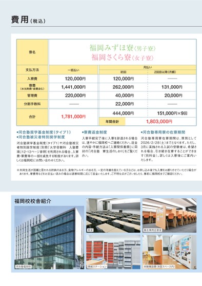 費用(税込)寮名支払方法入寮費寮費(水光熱費・食費含む)管理費分割手数料合計福岡みずほ寮〈男子寮〉福岡さくら寮〈女子寮〉一括払い120,000円1,441,000円220,000円----1,781,000円初回120,000円262,000円40,000円22,000円444,000円年間合計月払い2回目以降(月額)----131,000円20,000円----151,000円×9回1,803,000円●河合塾奨学基金制度(タイプ1)●河合塾被災者特別奨学制度河合塾奨学基金制度(タイプ1)や河合塾被災者特別奨学制度(別冊「大学受験科入塾要項」12・13ページ参照)を利用される場合、入寮費・寮費等の一部を減免する制度があります。詳しくは福岡校にお問い合わせください。●寮費返金制度入寮手続完了後に入寮を辞退される場合は、速やかに福岡校へご連絡ください。返金の内容・手続方法は「入寮関係書類」に同封の「河合塾寮生活のしおり」をご覧ください。●河合塾専用寮の在寮期間河合塾専用寮在寮期間は、原則として2026/2/28(土)までとなります。ただし、3月に実施される入試の受験者は、希望される場合、引き続き在寮することができます(別料金)。詳しくは入寮後にご案内いたします。※共同生活が困難と思われる持病のある方、食物アレルギーのある方、一定の年齢を超えている方などは、お申し込み後でも入寮をお断りさせていただく場合があります。寮費等などをお支払い済みの場合は退寮時期に応じて返金いたします。ご不明な点がございましたら、事前に福岡校までご確認ください。福岡校校舎紹介教室塾生専用自習室河合塾福岡校情報ステーション自販機設置(自習スペース内)