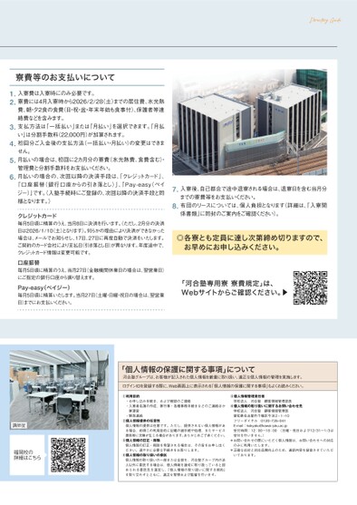 DmyGuide寮費等のお支払いについて1.2.3.4.5.6.入寮費は入寮時にのみ必要です。寮費には4月入寮時から2026/2/28(土)までの居住費、水光熱費、朝・夕2食の食費(日・祝・盆・年末年始も食事付)、保護者等連絡費などを含みます。支払方法は「一括払い」または「月払い」を選択できます。「月払い」は分割手数料(22,000円)が加算されます。初回分ご入金後の支払方法(一括払い・月払い)の変更はできません。月払いの場合は、初回に2カ月分の寮費(水光熱費、食費含む)・管理費と分割手数料をお支払いください。月払いの場合の、次回以降の決済手段は、「クレジットカード」、「口座振替(銀行口座からの引き落とし)」、「Pay-easyペイジー)」です。入塾手続時にご登録の、次回以降の決済手段と同様となります。)クレジットカード毎月5日頃に精算のうえ、当月8日に決済を行います。ただし、2月分の決済日は2026/1/10(土)となります)。何らかの理由により決済ができなかった場合は、メールでお知らせし、17日、27日に再度自動で決済をいたします。ご契約のカード会社により支払日(引き落とし日)が異なります。年度途中で、クレジットカード情報は変更可能です。口座振替毎月5日頃に精算のうえ、当月27日(金融機関休業日の場合は、翌営業日)にご指定の銀行口座から振り替えます。Pay-easy(ペイジー)毎月5日頃に精算いたします。当月27日(土曜・日曜・祝日の場合は、翌営業日)までにお支払いください。7.8.入寮後、自己都合で途中退寮される場合は、退寮日を含む当月分までの寮費等をお支払いください。布団のリースについては、個人負担となります(詳細は、入寮関係書類」に同封のご案内をご確認ください)。◎各寮とも定員に達し次第締め切りますので、お早めにお申し込みください。「河合塾専用寮寮費規定」は、Webサイトからご確認ください。▶「個人情報の保護に関する事項」について河合塾グループは、お客様が記入された個人情報を厳重に取り扱い、適正な個人情報の管理を実施します。ログインIDを登録する際に、Web画面上に表示される「個人情報の保護に関する事項」もよくお読みください。・お申し込み手続き、および確認のご連絡・入寮者名簿の作成、寮行事・各種事務手続きなどのご連絡ほか学校法人河合塾顧客情報管理部長⑥個人情報の取り扱いに関するお問い合わせ先⑤個人情報管理責任者講師室福岡校の詳細はこちら①利用目的寮運営・緊急連絡②個人情報提供の任意性個人情報の提供は任意です。ただし、提供されない個人情報がある場合、前項①の利用目的に記載の諸手続や処理、またサービス提供等に支障が生じる場合があります。あらかじめご了承ください。③個人情報の訂正・削除個人情報の訂正・削除を希望される場合は、その旨をお申し出ください。速やかに必要な手続きをお取りします。④個人情報の取り扱いの委託個人情報の取り扱いの一部または全部を、河合塾グループ内の法人以外に委託する場合は、個人情報を適切に取り扱っていると認められる委託先を選定し、「個人情報の取り扱いに関する契約」を取り交わすとともに、適正な管理および監督を行います。学校法人河合塾顧客情報管理部愛知県名古屋市千種区今池2110フリーダイヤル0120735041E-mail:kokyaku@kawai-juku.ac.jp受付時間:12:00〜18:00(日曜・祝日および12/31〜1/3は受付を行いません。)*お問い合わせの際にいただく個人情報は、お問い合わせへの対応*正確な応対と対応品質向上のため、通話内容を録音させていただのみに利用いたします。いております。
