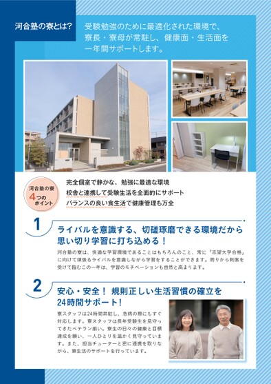 河合塾の寮とは?受験勉強のために最適化された環境で、寮長・寮母が常駐し、健康面・生活面を一年間サポートします。河合塾の寮4つのポイント12完全個室で静かな、勉強に最適な環境校舎と連携して受験生活を全面的にサポートバランスの良い食生活で健康管理も万全ライバルを意識する、切磋琢磨できる環境だから思い切り学習に打ち込める!河合塾の寮は、快適な学習環境であることはもちろんのこと、常に「志望大学合格」に向けて頑張るライバルを意識しながら学習をすることができます。周りから刺激を受けて臨むこの一年は、学習のモチベーションも自然と高まります。安心・安全!規則正しい生活習慣の確立を24時間サポート!寮スタッフは24時間常駐し、急病の際にもすぐ対応します。寮スタッフは長年受験生を見守ってきたベテラン揃い。寮生の日々の健康と目標達成を願い、一人ひとりを温かく見守っています。また、担当チューターと密に連携を取りながら、寮生活のサポートを行っています。