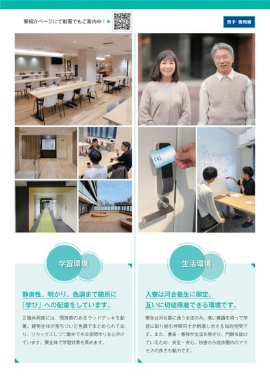 寮紹介ページにて動画でもご案内中!▲男子専用寮学習環境生活環境静粛性、明かり、色調まで随所に「学び」への配慮をしています。入寮は河合塾生に限定。互いに切磋琢磨できる環境です。2階共用部には、開放感のあるウッドデッキを配寮生は河合塾に通う生徒のみ。高い意識を持って学置。建物全体が落ちついた色調でまとめられてお習に取り組む仲間同士が刺激し合える知的空間でり、リラックスしつつ集中できる空間作りを心がけす。また、寮長・寮母が生活を見守り、門限を設けています。寮全体で学習効果を高めます。ているため、安全・安心。校舎から徒歩圏内のアクセスの良さも魅力です。