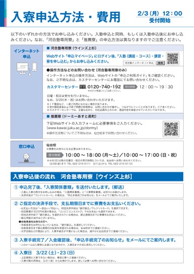 入寮申込方法・費用2/3(月)12:00受付開始以下のいずれかの方法でお申し込みください。入塾申込と同時、もしくは入塾申込後にお申し込みください。なお、「河合塾専用寮」と「推薦寮」の申込方法は異なりますのでご注意ください。インターネット申込■河合塾専用寮(ウインズ上杉)Webサイト「申込マイページ」にログイン後、「入塾(講座・コース)・講習・寮を申し込む」からお申し込みください。河合塾インターネット申込●操作方法などのお問い合わせ(河合塾専用寮のみ)インターネット申込の操作方法は、Webサイトの「申込ご利用ガイド」をご確認ください。なお、ご不明な点は、カスタマーセンターにお電話にてお問い合わせください。カスタマーセンター0120-740-194212:00〜19:30受付時間4Ⓡ※おかけ間違いにご注意ください。日曜・祝日は受付を行いません。なお、3/20(木・祝)はお問い合わせいただけます。※ⅠP電話など、一部ご利用になれない場合があります。※受付開始直後および終了間際の時間帯は、お問い合わせが集中し、つながりにくいことがあります。ご了承ください。※カスタマーセンターでは、正確な応対と、対応品質向上のため、通話内容を録音させていただいております。■推薦寮(ドーミーあすと長町)下記Webサイトの入力フォームに必要事項をご入力ください。(www.kawai-juku.ac.jp/dormy)※操作方法等についてご不明な点は、仙台校までお問い合わせください。窓口申込仙台校※寮費をお持ちになる必要はありません。受付時間10:00〜18:00(月〜土)/10:00〜17:00(日・祝)※4/6(日)以降の日曜日・祝日の受付時間については、仙台校へお問い合わせください。(2/28(金)までTEL022-215-51113/1(土)からTEL022-215-5112)入寮申込後の流れ河合塾専用寮【ウインズ上杉】①申込完了後、「入寮関係書類」を送付いたします。(郵送)・入塾と入寮の両方をお申し込みの場合、「入塾関係書類」と「入寮関係書類」は別々にお届けします。・決済手段が「クレジットカード」の場合は、「申込手続完了のお知らせ」をメールにてご案内いたします。②ご指定の決済手段で、支払期限日までに寮費をお支払いください。・お支払い方法は「一括払い/月払い」、初回決済手段は「銀行振込/クレジットカード」を選択できます。・初回寮費が30万円未満の場合は、「コンビニエンスストア」でのお支払いも選択できます。・初回決済手段で「銀行振込」を選択されている場合は、振込期限日までに寮費をお支払いください。・振込用紙の送付はございません。●合格発表をお待ちの方へ・合格発表をお待ちになっている方は、「銀行振込」を選択してください。・合格発表日まで振込期限日の延長を希望される場合は、仙台校までご連絡ください。・大学合格などの理由により、入寮手続きが不要になった場合は、速やかに仙台校までご連絡ください。③入寮手続完了/入金確認後、「申込手続完了のお知らせ」をメールにてご案内します。・このメールは入寮時に必要となりますので、入寮日まで大切に保存してください。④入寮日3/22(土)・23(日)・上記期間に入寮できない場合は、事前に寮へご連絡ください。・入寮の際の荷物は、3/21(金)からお預かりします。詳しくは寮へお問い合わせください。