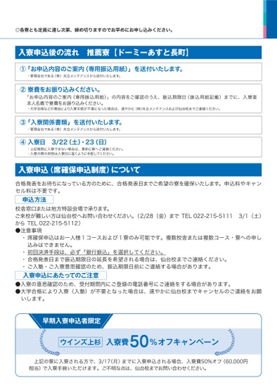 ◎各寮とも定員に達し次第、締め切りますのでお早めにお申し込みください。入寮申込後の流れ推薦寮【ドーミーあすと長町】①「お申込内容のご案内(専用振込用紙)」を送付いたします。・管理会社である(株)共立メンテナンスから送付いたします。②寮費をお振り込みください。「お申込内容のご案内(専用振込用紙)」の内容をご確認のうえ、振込期限日(振込用紙記載)までに、入寮者本人名義で寮費をお振り込みください。・大学合格などの理由により入寮手続が不要になった場合は、速やかに(株)共立メンテナンスおよび仙台校までご連絡ください。③「入寮関係書類」を送付いたします。・管理会社である(株)共立メンテナンスから送付いたします。④入寮日3/22(土)・23(日)・上記期間に入寮できない場合は、事前に寮へご連絡ください。・入寮の際の荷物は入寮日に届くように手配してください。入寮申込(席確保申込制度)について合格発表をお待ちになっている方のために、合格発表日までご希望の寮を確保いたします。申込料やキャンセル料は不要です。申込方法校舎窓口または地方特設会場で承ります。ご来校が難しい方は仙台校へお問い合わせください。(2/28(金)までTEL022-215-51113/1(土)からTEL022-215-5112)●注意事項・席確保申込はお一人様1コースおよび1寮のみ可能です。複数校舎または複数コース・寮への申し込みはできません。初回決済手段は、必ず「銀行振込」を選択してください。・合格発表日まで振込期限日の延長を希望される場合は、仙台校までご連絡ください。・・ご入塾・ご入寮意思確認のため、振込期限日前にご連絡する場合があります。入寮申込にあたってのご注意●入寮の意思確認のため、受付期間内にご登録の電話番号にご連絡をする場合があります。●大学合格により入寮(入塾)が不要となった場合は、速やかに仙台校までキャンセルのご連絡をお願いします。早期入寮申込者限定ウインズ上杉入寮費50%オフキャンペーン上記の寮に入寮される方で、3/17(月)までに入寮申込される場合、入寮費50%オフ(60,000円相当)で入寮手続いただけます。ご不明な点は、仙台校までお問い合わせください。