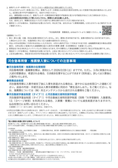 3.食物アレルギー疾患のうち、アナフィラキシー病型の方は入寮をお断りしています。それ以外のアレルギー疾患においても、食物アレルギーの原因となる特定の食材を使用しない代替食や除去食の提供はいたしません。当日献立表やPOPを確認のうえ、各自でご対応ください。また、調理過程におきまして、食物アレルギーの原因食材が意図せず他食材に混入する可能性があることをご承知おきください。上記の食事対応の内容にご了解いただいてから、寮費の入金をお願いします。なお、症状により、寮費をお支払いいただいた後でも入寮をお断りさせていただく場合があります。4.寝具をリースする場合は、別途料金が必要となります。申込完了後、送付される「入寮関係書類」に封入されているご案内チラシをご確認ください。「河合塾専用寮寮費規定」はWebサイトよりご確認ください。▼〈推薦寮について〉1.第3・第5土曜、日曜、祝日は食事の提供がございません。また、夏期と年末年始で各7日、食事の提供がない日があります[また、入寮日から3/31(月)、社員研修日(年に1日)も食事の提供を行いません]。2.月払いの方は初回時に1カ月分をお支払いいただきます。4月から毎月27日に(1月末までの全10回・金融機関休業日の場合は翌営業日)、お申込時にご登録された金融機関口座から翌月分の寮費(食費・水光熱費含む)を振替いたします。3.管理会社である(株)共立メンテナンスとのご契約になります。月々の費用として通信設備費(3,960円/税込)が別途必要です。また、寝具をリースする場合は、別途料金が必要となります。上記は(株)共立メンテナンスからご請求いたします。4.上記支払額の他に、保証金50,000円が別途必要となります。詳しくは(株)共立メンテナンスから送付される書類をご覧ください。河合塾専用寮・推薦寮入寮についての注意事項●河合塾専用寮・推薦寮の在寮期間河合塾専用寮・推薦寮在寮は、原則として2026/2/28(土)までです。ただし、3月に実施される入試の受験者は、希望される場合、引き続き在寮することができます(別料金)。詳しくは入寮後にご案内いたします。●寮費返金制度河合塾専用寮に入寮手続完了後に入寮を辞退される場合は、速やかに仙台校窓口へご連絡ください。返金の内容・手続方法は入寮手続書類に同封の「寮生活のしおり」をご覧ください。なお、推薦寮については(株)共立メンテナンスから送付される書類をご覧ください。●河合塾奨学基金制度(タイプ1)と河合塾被災者特別奨学制度河合塾奨学基金制度(タイプ1)や河合塾被災者特別奨学制度(別冊「大学受験科入塾要項」12,13ページ参照)を利用される場合、入寮費・寮費についても減免制度がありますので、仙台校窓口にお問い合わせください。※推薦寮(ドーミーあすと長町)・紹介物件は、対象外です。※共同生活が困難と思われる持病のある方、食物アレルギーのある方、一定の年齢を超える方などは、お申し込み後でも入寮をお断りする場合があります(食物アレルギーに関し、アナフィラキシー病型の方の入寮はお断りしております)。入寮費などをお支払い済みの場合は退寮時期に応じた寮費を返金いたします。ご不明な点がございましたら、事前に仙台校窓口までご確認ください。「個人情報の保護に関する事項」について河合塾グループは、お客様が記入された個人情報を厳重に取り扱い、適正な個人情報の管理を実施します。ログインIDを登録する際に、Web画面上に表示される「個人情報の保護に関する事項」もよくお読みください。①利用目的・お申し込み手続き、および確認のご連絡・入寮者名簿の作成、寮行事・各種事務手続きなどのご連絡ほか寮運営・緊急連絡②個人情報提供の任意性個人情報の提供は任意です。ただし、提供されない個人情報がある場合、前項①の利用目的に記載の諸手続や処理、またサービス提供等に支障が生じる場合があります。あらかじめご了承ください。③個人情報の訂正・削除個人情報の訂正・削除を希望される場合は、その旨をお申し出ください。速やかに必要な手続きをお取りします。④個人情報の取り扱いの委託個人情報の取り扱いの一部または全部を、河合塾グループ内の法人以外に委託する場合は、個人情報を適切に取り扱っていると認められる委託先を選定し、「個人情報の取り扱いに関する契約」を取り交わすとともに、適正な管理および監督を行います。⑤個人情報管理責任者学校法人河合塾顧客情報管理部長⑥個人情報の取り扱いに関するお問い合わせ先学校法人河合塾顧客情報管理部愛知県名古屋市千種区今池2110フリーダイヤル0120735041E-mail:kokyaku@kawai-juku.ac.jp受付時間:12:00〜18:00(日曜・祝日および12/31〜1/3は受付を行いません。)*お問い合わせの際にいただく個人情報は、お問い合わせへの対応のみに利用いたします。*正確な応対と対応品質向上のため、通話内容を録音させていただいております。