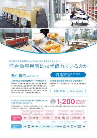 河合塾の塾生専用だからできる、安心快適なフルサポート河合塾専用寮はなぜ優れているのか塾生専用へのこだわり入寮できるのは河合塾グループの塾生だけ!啓発寮は、河合塾が塾生専用に運営する河合塾専用寮です。大学生や社会人など塾生以外の方は入寮できません。全国から集まった仲間とともに学習を最優先に考えた環境で、志望大学合格に向け集中して学べます。また全室個室なので、プライベートな時間も確保できます。通塾可能な圏内にお住まいの方も、多数入寮しています。河合塾専用寮は名駅校から徒歩圏内!勉強時間をしっかり確保することができ、登下校時も安心です。啓発寮(男子寮)名駅校まで徒歩4分ひとり暮らしでは、家事や通塾に意外と時間を取られます。河合塾専用寮とひとり暮らしでは、年間の勉強時間が1,200時間以上も違います。河合塾専用寮は、土・日・祝日含めて毎日2食付き(朝・夕)であることや、寮生専用自習室を完備していること、校舎が徒歩圏内にあることなど、手厚いサポートで勉強時間を確保します。食堂に行けば食事ができている校舎が徒歩圏内なので、数分で登校在室の場合は寮長から声掛け土・日・祝日含めて毎日2食付き(朝・夕)個別ブースや音読室など、多彩な自習室を完備河合塾専用寮の場合起床朝食通塾予習など塾にて授業予習・復習帰寮・夕食入浴など自由時間・勉強等就寝6:307:007:309:1017:0018:0019:0020:0021:300:00ひとり暮らしの場合起床朝食準備朝食通塾塾にて授業夕食の買物・帰宅夕食準備夕食後片付け入浴自由時間・勉強等就寝