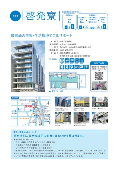 JR名古屋駅まで徒歩6分千種校までJR名古屋駅からJR千種駅まで電車で10分JR千種駅から徒歩1分千種校JR千種駅寮JR名古屋駅名駅校まで徒歩4分名駅校寮[各校舎までのアクセス]男子寮啓発寮最高峰の学習・生活環境でフルサポート員定[][建物概要][][電話番号]][住所交通83名(全室個室)鉄筋コンクリート9階建〒453-0013名古屋市中村区亀島2-6-6(052)452-6583JR名古屋駅から徒歩6分、地下鉄・名鉄・近鉄名古屋駅から徒歩9分[共用設備]食事談話スペース自習室湯沸室音読室洗濯機/乾燥機飲料自販機エレベーターセキュリティ・システムパソコンWi-Fi動画で内覧啓発寮の様子を動画でご視聴いただけます。バルコニー靴箱洗濯機冷蔵庫ロッカー本棚机〈2017年度優秀照明施設東海支部長賞受賞〉▲寮室イメージ図周辺MAP235465551123JRセントラルタワーズやJR名古屋駅も近いです。飲み物なども買える食品スーパーです。近くには交番があります。456校医(内科)が近くにあるので安心です。何かと便利なコンビニが寮のすぐ近くにあります。銭湯でリフレッシュできます。寮長・寮母からのメッセージ声かけをし、日々の様子に変わりはないかを見守ります。寮生の皆さんに対しては、◎ひとり暮らしの不安などを少しでも軽減する◎勉強に打ち込める環境づくりに努める◎一人ひとりの体調管理に特に注意を払う…等々を心がけています。多くの寮生が共同生活をしていますが、顔と名前をしっかり覚え、○○君、おはよう!”と声かけをし、日々の様子に変わりはないかを見守っています。親御さんにおいては、ご子息が遠く離れてご心配でしょうが、充実した寮生活を送り志望大学合格を果たすお手伝いをさせていただきます。