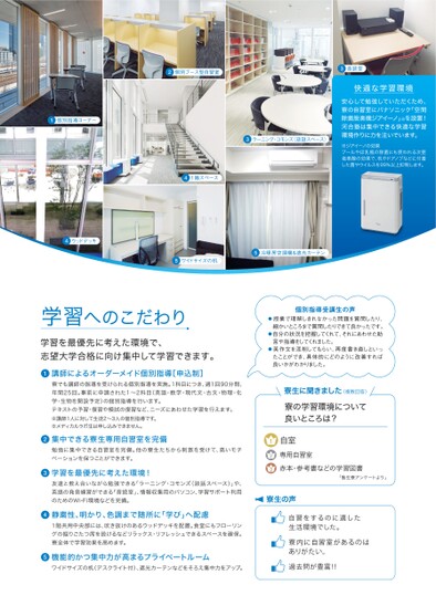 1個別指導コーナー2個別ブース型自習室41階スペース3音読室快適な学習環境安心して勉強していただくため、寮の自習室にパナソニック「空間除菌脱臭機ジアイーノ」※を設置!河合塾は集中できる快適な学習環境作りに力を注いでいます。※ジアイーノの効果プールやほ乳瓶の除菌にも使われる次亜塩素酸の効果で、机やドアノブなどに付着した菌やウイルスを99%以上抑制します。3ラーニング・コモンズ(談話スペース)4ウッドデッキ5ワイドサイズの机5冷暖房空調機&遮光カーテン学習へのこだわり学習を最優先に考えた環境で、志望大学合格に向け集中して学習できます。●講師によるオーダーメイド個別指導[申込制]1寮でも講師の指導を受けられる個別指導を実施。1科目につき、週1回90分間、年間25回。事前に申請された1〜2科目(英語・数学・現代文・古文・物理・化学・生物を開設予定)の個別指導を行います。テキストの予習・復習や模試の復習など、ニーズにあわせた学習を行えます。※講師1人に対して生徒2〜3人の個別指導です。※メディカルラボ生は申し込みできません。●集中できる寮生専用自習室を完備2勉強に集中できる自習室を完備。他の寮生たちから刺激を受けて、高いモチベーションを保つことができます。●学習を最優先に考えた環境!3友達と教え合いながら勉強できる「ラーニング・コモンズ(談話スペース)」や、英語の発音練習ができる「音読室」、情報収集用のパソコン、学習サポート利用のためのWi-Fi環境などを完備。●静粛性、明かり、色調まで随所に「学び」へ配慮41階共用中央部には、吹き抜けのあるウッドデッキを配置。食堂にもフローリングの掘りごたつ席を設けるなどリラックス・リフレッシュできるスペースを確保。寮全体で学習効果を高めます。●機能的かつ集中力が高まるプライベートルーム5ワイドサイズの机(デスクライト付)、遮光カーテンなどをそろえ集中力をアップ。個別指導受講生の声授業で理解しきれなかった問題を質問したり、細かいところまで質問したりできて良かったです。自分の状況を把握してくれて、それにあわせた助言や指導をしてくれました。英作文を添削してもらい、再度書き直しといったことができ、具体的にどのように改善すれば良いかがわかりました。(複数回答)寮生に聞きました寮の学習環境について良いところは?123自室専用自習室赤本・参考書などの学習図書「塾生寮アンケートより」寮生の声自習をするのに適した生活環境でした。寮内に自習室があるのはありがたい。過去問が豊富!!