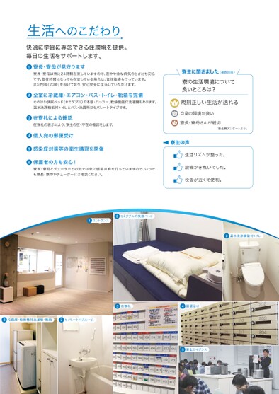 生活へのこだわり快適に学習に専念できる住環境を提供。毎日の生活をサポートします。●寮長・寮母が見守ります1寮長・寮母は寮に24時間在室していますので、夜中や急な病気のときにも安心です。登校時間になっても在室している場合は、登校指導も行っています。また門限(20時)を設けており、安心安全に生活していただけます。●全室に冷蔵庫・エアコン・バス・トイレ・靴箱を完備2そのほか快眠ベッド(セミダブル)や本棚・ロッカー、乾燥機能付洗濯機もあります。温水洗浄機能付トイレとバス・洗面所はセパレートタイプです。●在寮札による確認3在寮札の表示により、寮生の在・不在の確認をします。●個人宛の郵便受け4●感染症対策等の衛生講習を開催5●保護者の方も安心!6寮長・寮母とチューターとの間では常に情報共有を行っていますので、いつでも寮長・寮母やチューターにご相談ください。(複数回答)寮生に聞きました寮の生活環境について良いところは?規則正しい生活が送れる自室の環境が良い寮長・寮母さんが親切123「塾生寮アンケートより」寮生の声生活リズムが整った。設備がきれいでした。校舎が近くて便利。1エントランス2セミダブルの快眠ベッド2温水洗浄機能付トイレ2冷蔵庫・乾燥機付洗濯機・靴箱2セパレートバスルーム3在寮札4郵便受け5寮生ガイダンス