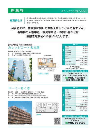 推薦寮男子・女子とも入寮できます。推薦寮とは河合塾が推薦する学生会館や学生寮です。河合塾生以外の学生が入寮しています。寮父寮母が住み込み、河合塾専用寮と同等の衛生管理基準で運営され食事提供を行っています。河合塾では、推薦寮に関してお答えすることができません。各物件の入寮申込・寮見学申込・お問い合わせは直接管理会社へお願いいたします。寮費一覧100,000円70,000円11,000円228,000円ー29,980円29,980円(税込)電気水道代(オール電化)13,000円(税込)入館金保証金火災保険料年間管理費仲介手数料賃料入館時食費(週7日)水道光熱費毎月インターネット利用料3,300円(税込)見学のご予約はお早めにお申し込みください。入寮申込・寮見学申込・お問い合わせ(株)毎日コムネット学生マンション総合案内センター0120-423-280(03-5204-8502)寮費一覧132,000円50,000円ー282,000円ー①70,400円②73,400円17,600円(税込)電気料金2,261円(税込)+使用料、水道料金2,200円(税込)入館金保証金火災保険料年間管理費仲介手数料賃料食費水道光熱費入館時毎月インターネット利用料3,960円(税込)入寮申込・寮見学申込・お問い合わせ株式会社共立メンテナンス名古屋支店0120-93-5606【学生専用】〈週7日食事提供〉カレッジコート名古屋建物概要:鉄筋コンクリート造地上7階建住交所:〒453-0022愛知県名古屋市中村区中島町1-26通:JR「名古屋」駅から徒歩12分11.28㎡〜12.38㎡ドーミーちくさ建物概要:鉄筋コンクリート造6階建所:〒464-0850愛知県名古屋市千種区今池2-2-20募集定員:160名住ホームページ:https://dormy-nagoya.com/find/property/chikusa-1/交通:JR中央線・名古屋市営地下鉄東山線「千種」駅徒歩約5分ベッド18.00㎡