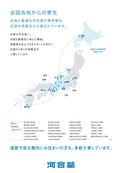 全国各地からの寮生合格に最適な河合塾の専用寮は全国の受験生から選ばれています。志望大学合格へ。学習を最優先に考えた環境。保護者も安心できるサポートを求めて、全国から多くの受験生が入寮しています。北海道寮生の出身高校県(過去3カ年)新潟富山石川福井滋賀栃木岐阜長野静岡三重香川兵庫奈良福岡鹿児島寮生の出身高校(過去3カ年)高志高校(福井県)飯田高校(長野県)松本深志高校(長野県)斐太高校(岐阜県)鶯谷高校(岐阜県)静岡高校(静岡県)松本秀峰中等教育学校(長野県)浜松西高校(静岡県)西尾高校(愛知県)岡崎高校(愛知県)時習館高校(愛知県)東海高校(愛知県)四日市高校(三重県)津高校(三重県)伊勢高校(三重県)三重高校(三重県)高田高校(三重県)岐阜高校(岐阜県)大垣北高校(岐阜県)静岡聖光学院高校(静岡県)滝高校(愛知県)浜松日体高校(静岡県)海陽中等教育学校(愛知県)鈴鹿中等教育学校(三重県)多治見北高校(岐阜県)刈谷高校(愛知県)南山高校(男子部)愛知県)など通塾可能な圏内にお住まいの方も、多数入寮しています。