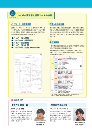 POINT!教科講座名必須英語数学理科情報英語国語選択地歴・公民プラス講座英語小論文2科目選択ハイパー東大英語/ComprehensiveEnglish実戦演習タイム東大リスニング・東大英作文ハイパー東大理類数学①ハイパー東大理類数学②ハイパー東大理類数学演習ハイパー東大物理ハイパー東大化学ハイパー東大生物情報Ⅰ共通対応英語①解釈二次・共通テスト対応英語②表現二次・共通テスト対応英語③長文二次・共通テスト対応実戦演習タイム英文法・語法演習Tトップレベル現代文論述東大二次対応トップレベル古文論述東大二次対応トップレベル漢文論述東大二次対応実戦演習タイム東大国語実戦演習タイム現代文共通テスト対応実戦演習タイム古文論述対応実戦演習タイム漢文共通テスト対応歴史総合,日本史探究共通テスト対応歴史総合,世界史探究共通テスト対応地理総合,地理探究共通テスト対応公共,倫理共通テスト対応公共,政治・経済共通テスト対応SpeakingTraining自然科学系小論文/医系小論文/看護・保健・歯学系小論文髙※一部、映像授業になる場合があります。※小論文は、別途添削料が必要です。※校舎により、必須科目・選択科目や設置講座が異なります。