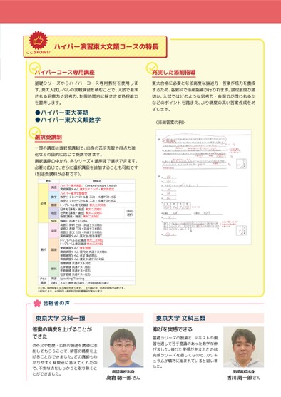 POINT!教科講座名2科目選択必須英語数学国語地歴情報英語選択国語理科プラス講座英語小論文東大英語/ComprehensiveEnglish実戦演習東大・東大英作文東大文類数学数学①ⅡB+型二次・共通対応数学②ⅡB+型二次・共通対応現代文論述東大二次対応日本史[講義・論述]東大二次対応世界史[講義・論述]東大二次対応地理[講義・論述]東大二次対応情報Ⅰ共通対応英語①解釈二次・共通対応英語②表現二次・共通対応英語③長文二次・共通対応実戦演習英文法・語法演習T古文論述東大二次対応漢文論述東大二次対応実戦演習東大国語実戦演習現代文共通対応実戦演習古文論述対応実戦演習漢文共通対応物理基礎共通ト対応化学基礎共通対応生物基礎共通テ対応地学基礎共通ス対応SpeakingTraining人文・教育系小論文/社会科学系小論文※一部、映像授業になる場合があります。※小論文は、別途添削料が必要です。※校舎により、必須科目・選択科目や設置講座が異なります。